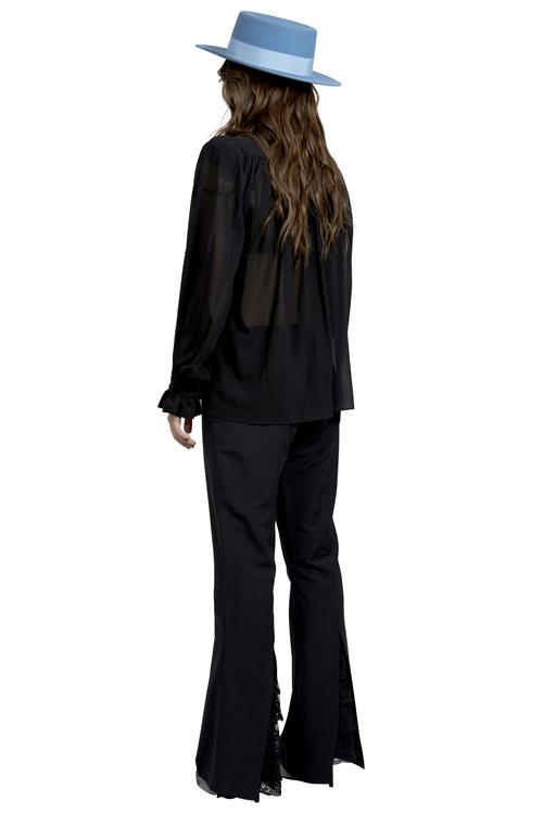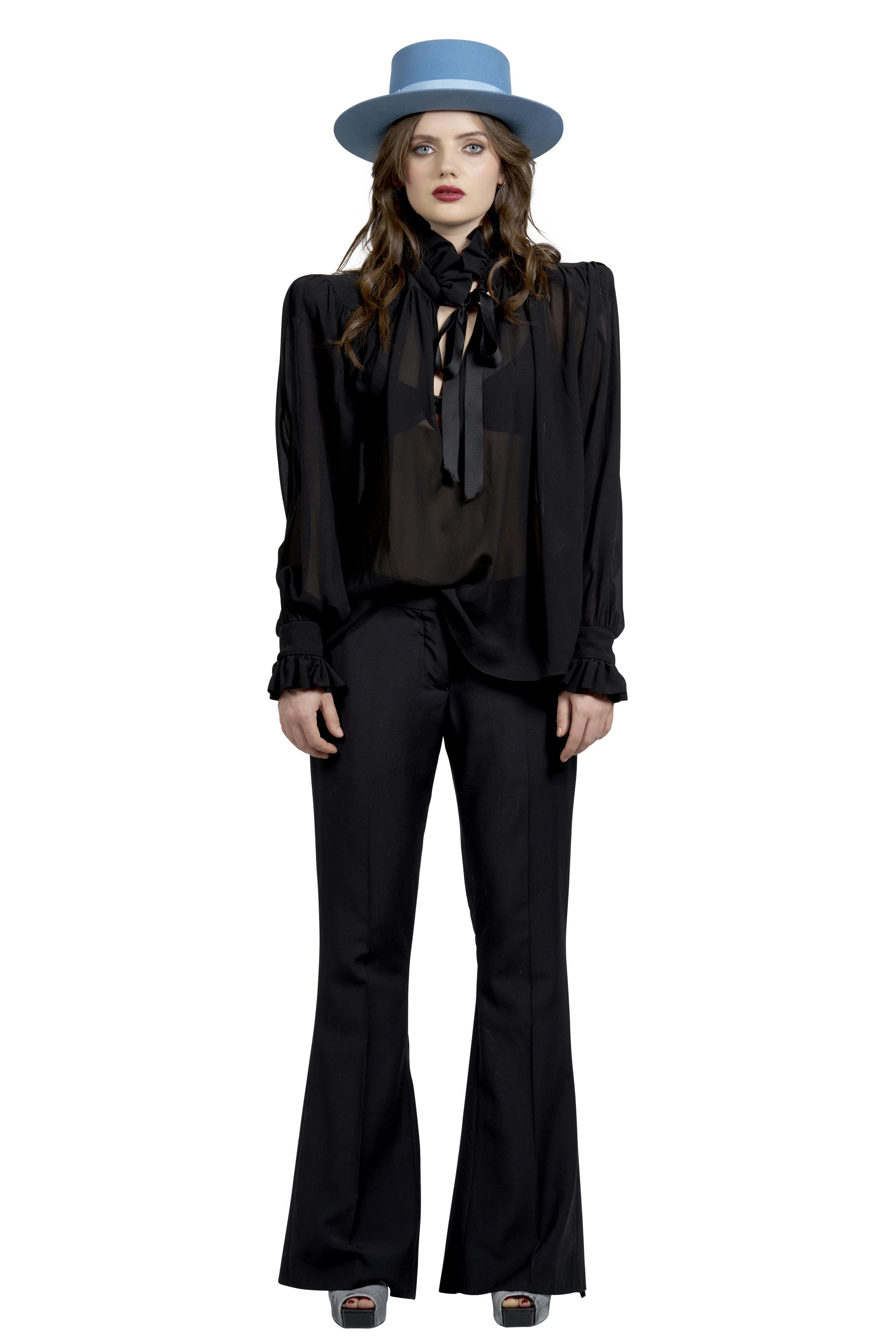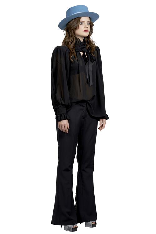This blouse reflects Anthony Vaccarello's Saint Laurent era, where gothic romanticism and sharp tailoring merged with archival codes. The transparency and oversized bow nod to 1970s Saint Laurent Rive Gauche, updated through a sleek, modern cut.
