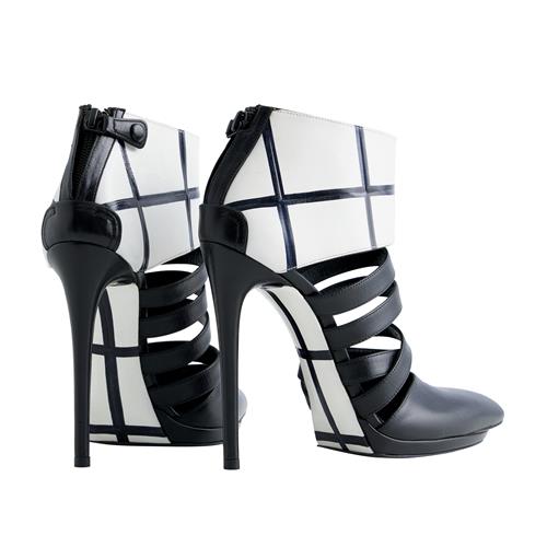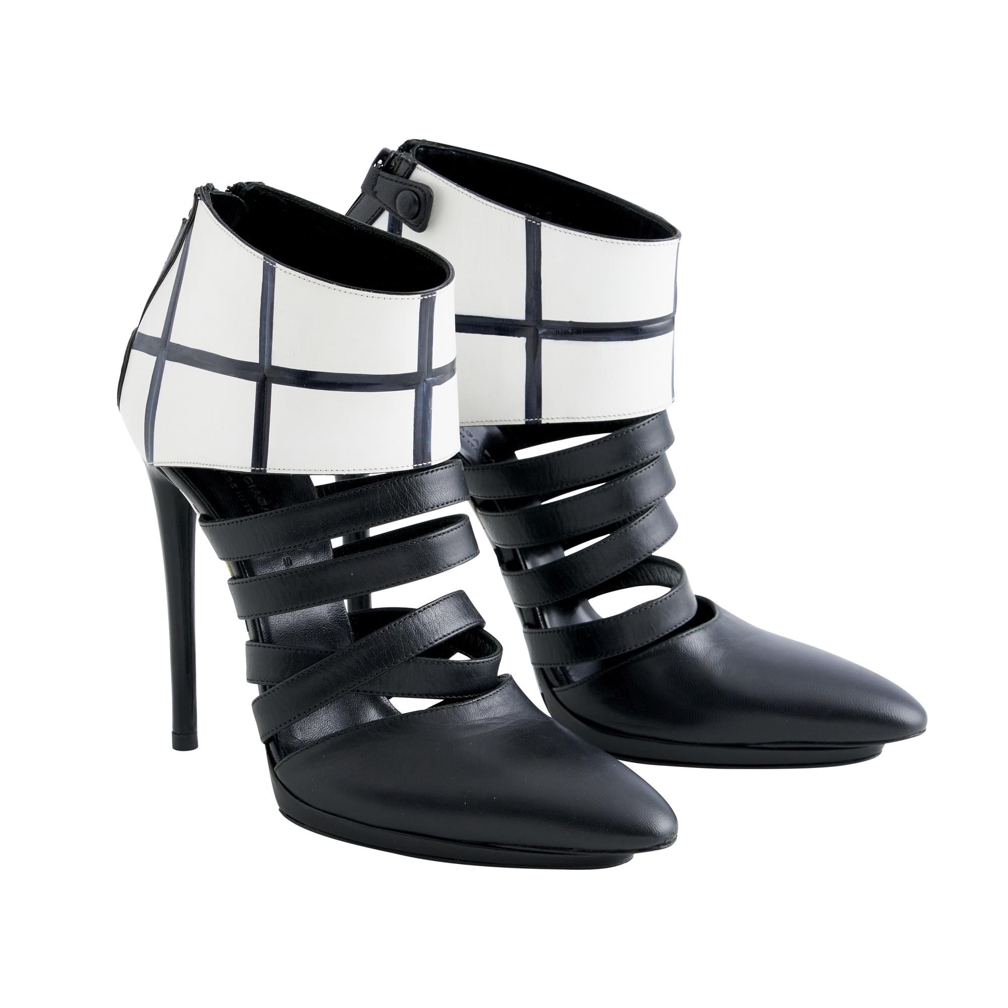 Styled in black and white leather featuring grid line motif, designed with strappy vamp detail, pointed toe and heel measuring 12cm, marked size 37.