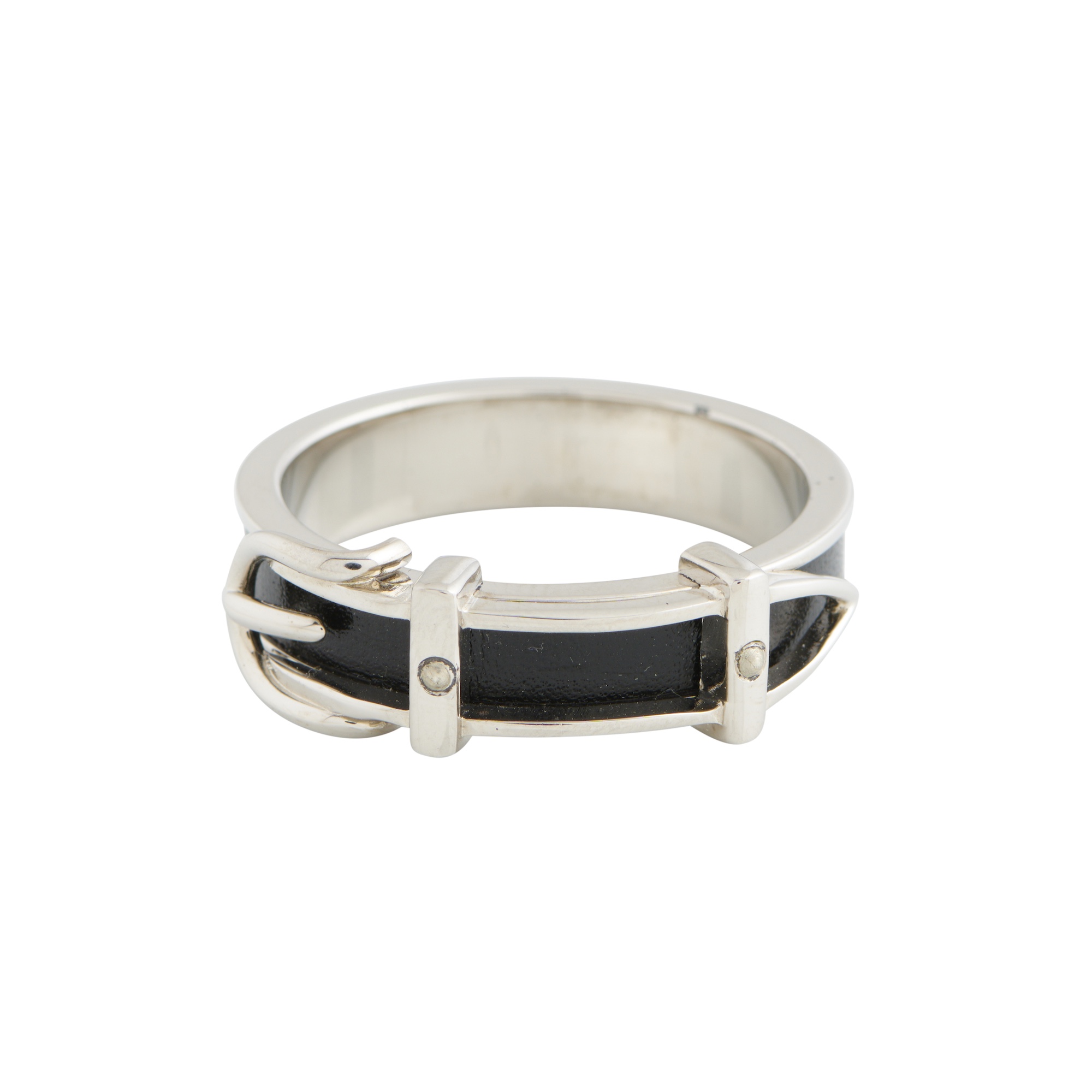 Styled as a belt in silver tone metal with black box leather accent, featuring sculpted buckle and band details, measures 3 x 0.7 x 3 cm. From a private single-owner collection.