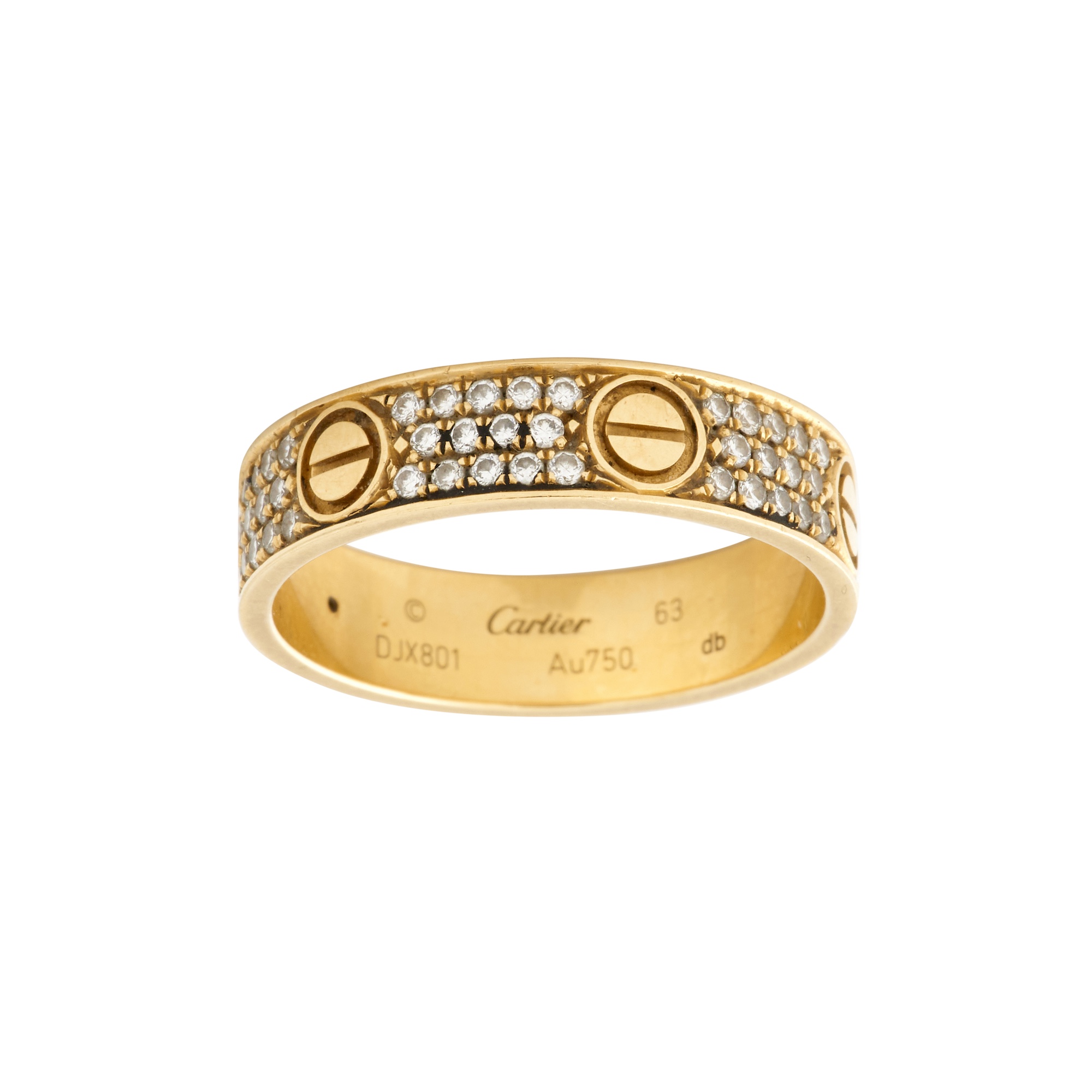 The flat band pavé-set throughout with round brilliant-cut diamonds together weighing approximately 0.30 carats, and decorated at intervals with screwhead motifs, signed Cartier, numbered DJX801, size U (63), gross weight approximately 5.5 grams.