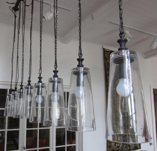 Comprising eight truncated glass shades suspended on a chain from a wrought iron ceiling plate, 225 long x 186cm drop.