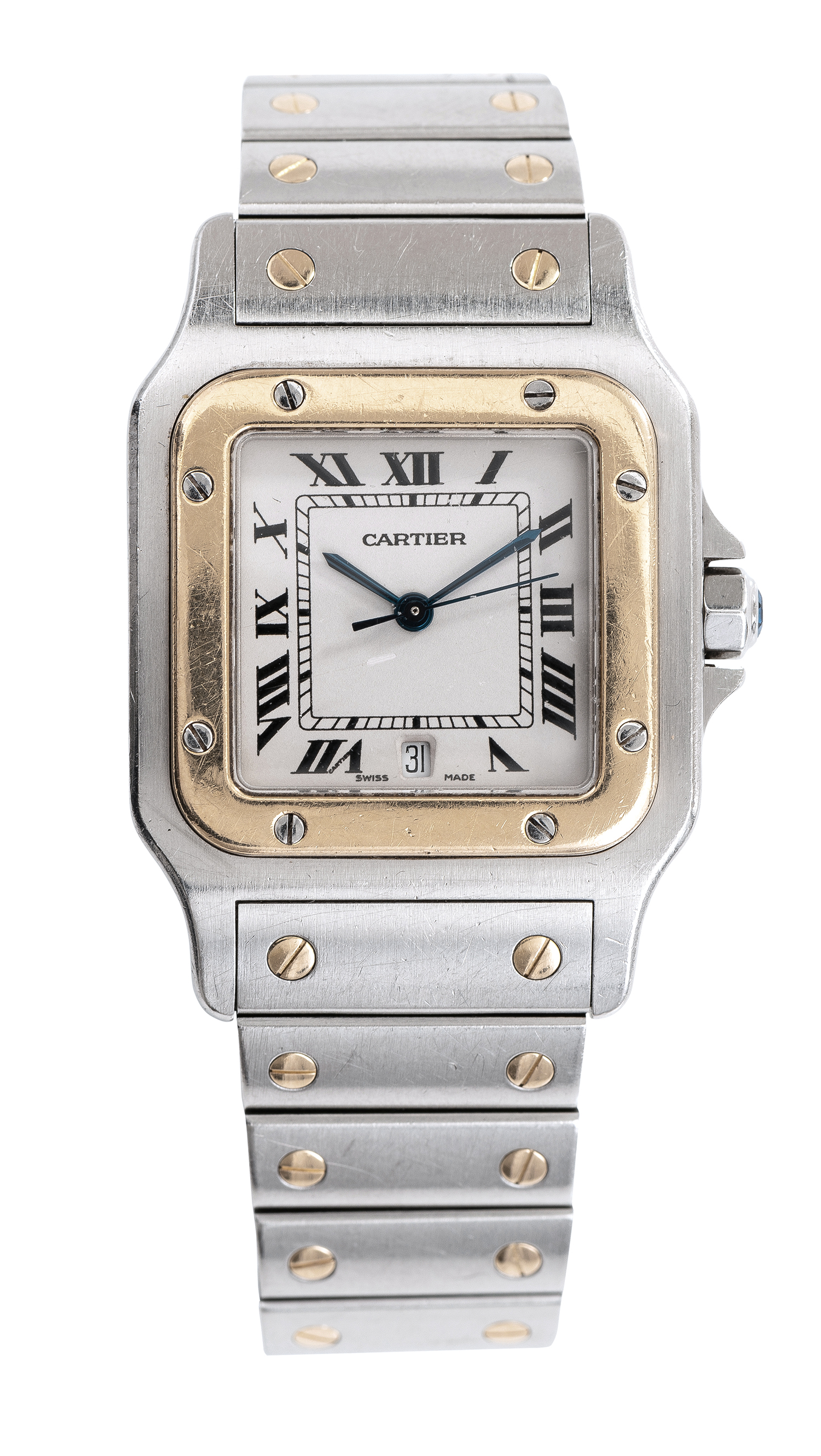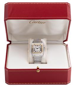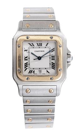 Quartz movement, square white dial with black Roman numerals, date aperture at six, signed case, dial and movement, gold and stainless steel case and conforming bracelet bands, case reference CC765055, total length 180mm, case length 30mm diameter, boxed with papers.