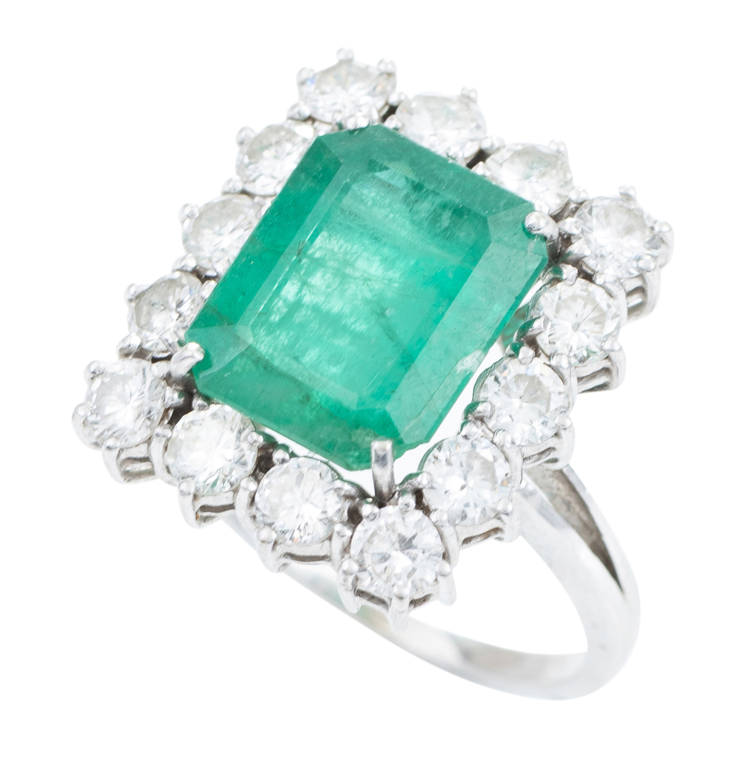 Of cluster design, featuring an emerald cut emerald of 3.68cts, surrounded by a border of round brilliant cut diamonds totalling 1.40cts, mounted in white gold, ring size L.