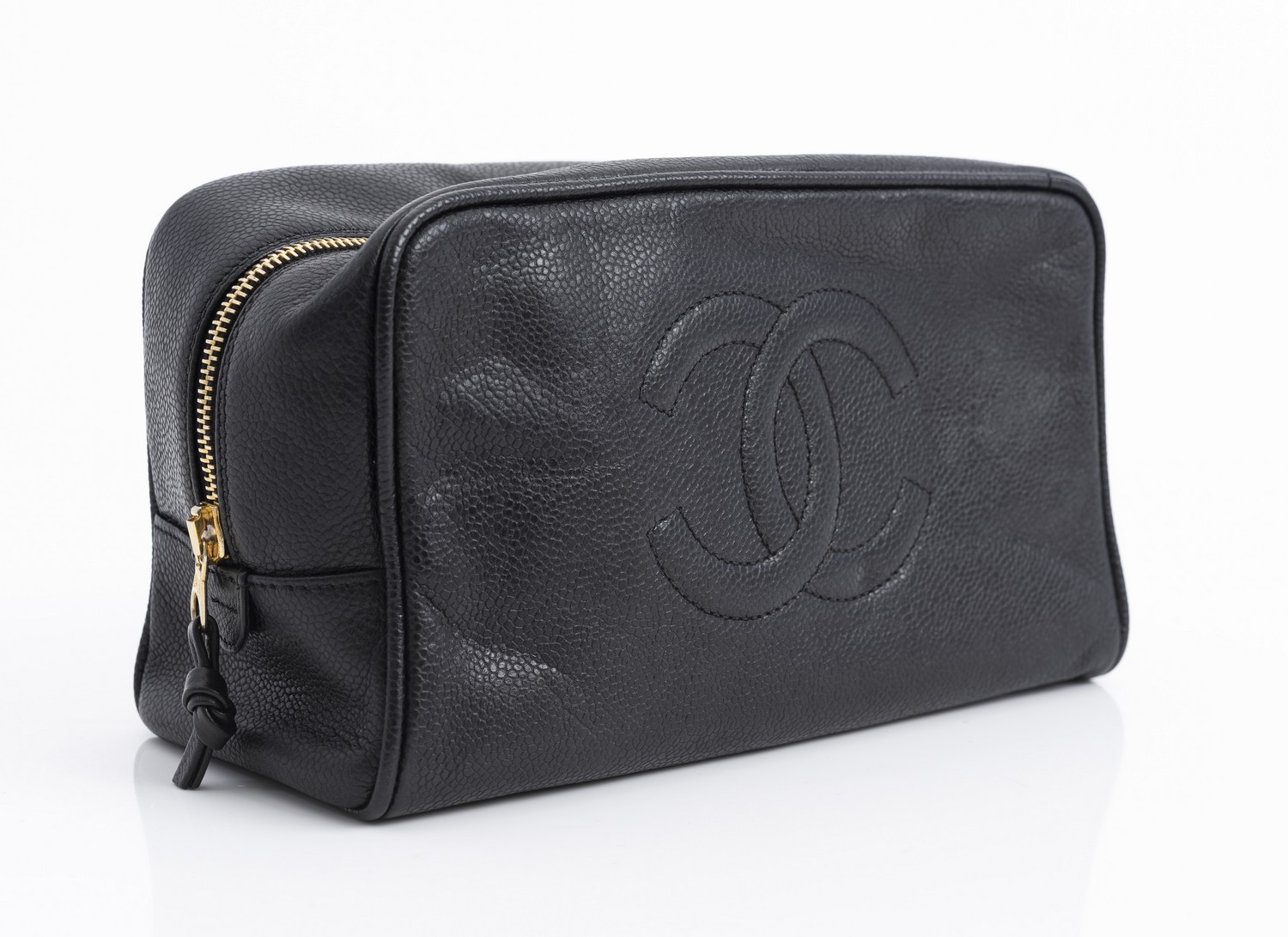 Styled in black Caviar leather with gold metal hardware, 12 x 22 x 9cm.