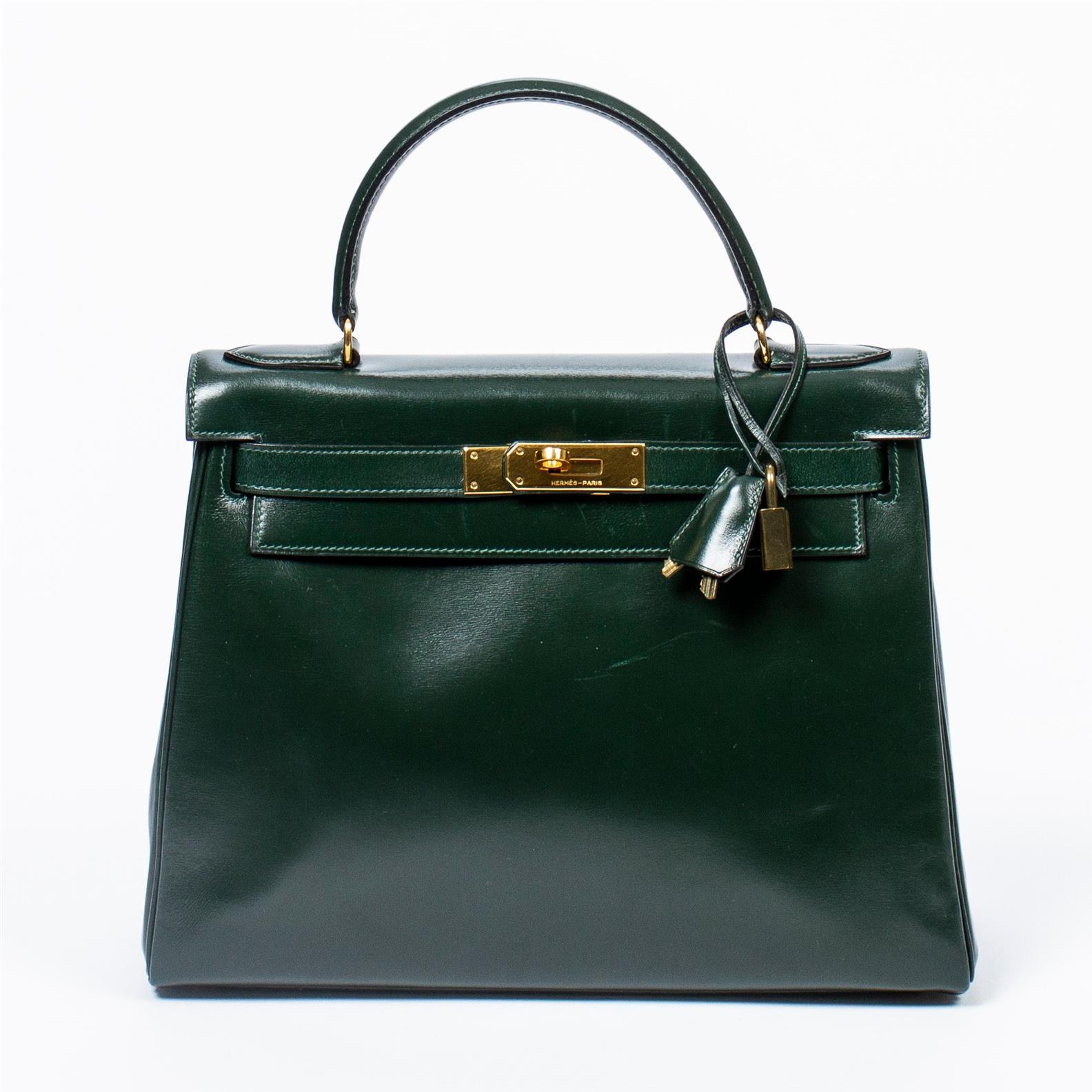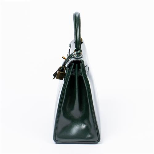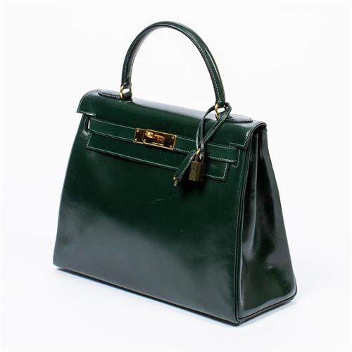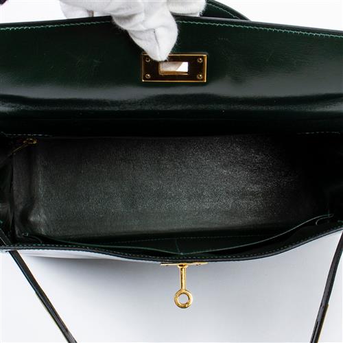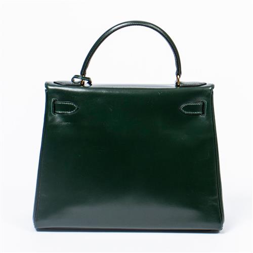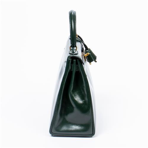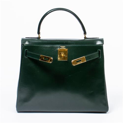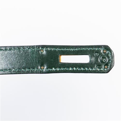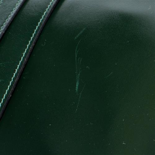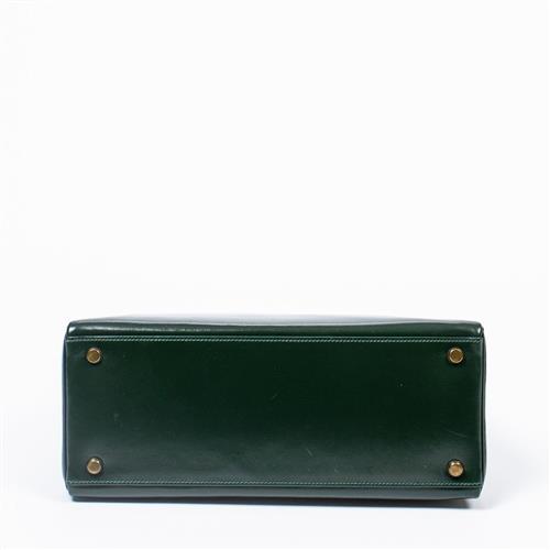 Styled in dark green box leather and gold tone hardware, 28 x 22 x 11cm.