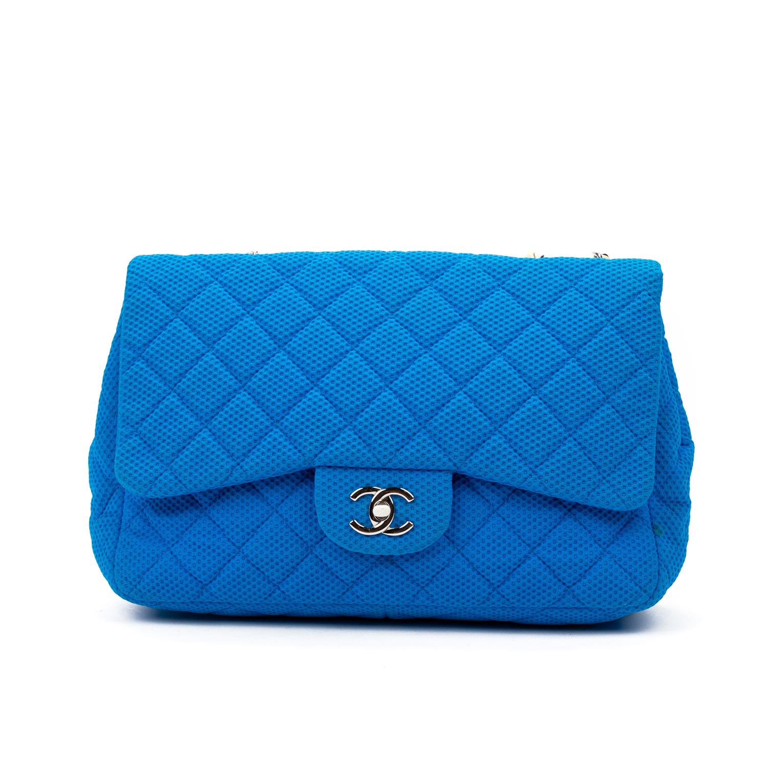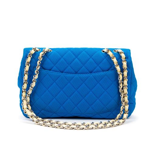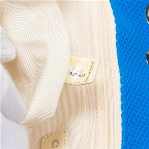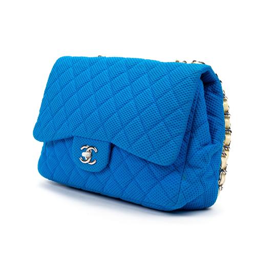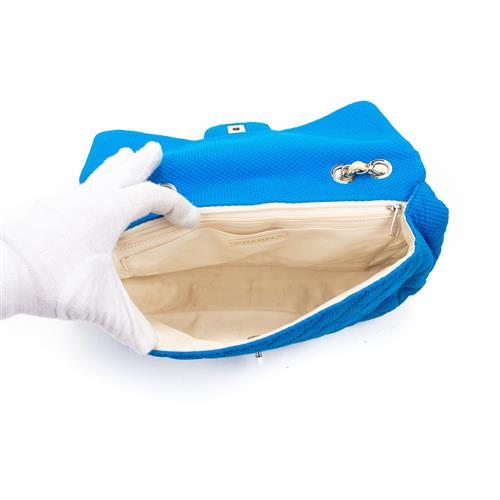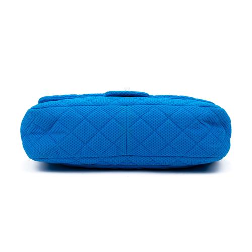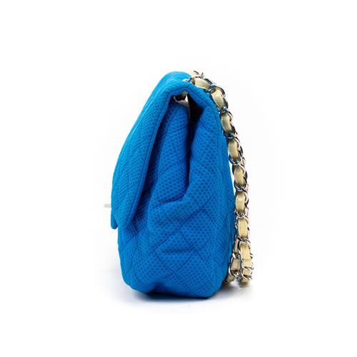 Styled in blue perforated quilted jersey with interlaced white leather chain shoulder strap and silver tone metal hardware, 30 x 19 x 10cm.