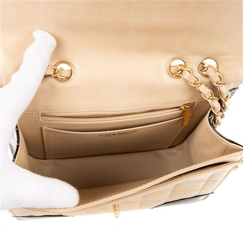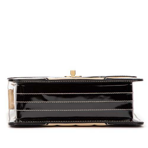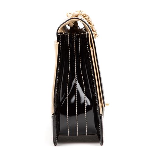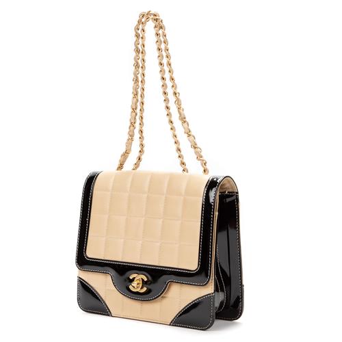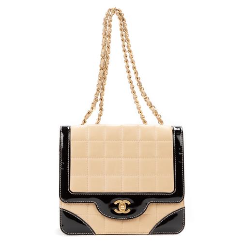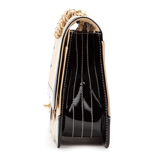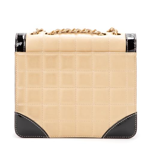 Styled in black and ivory calfskin leather with interlaced chain shoulder strap and gold tone metal hardware, 23 x 19 x 7.5cm.