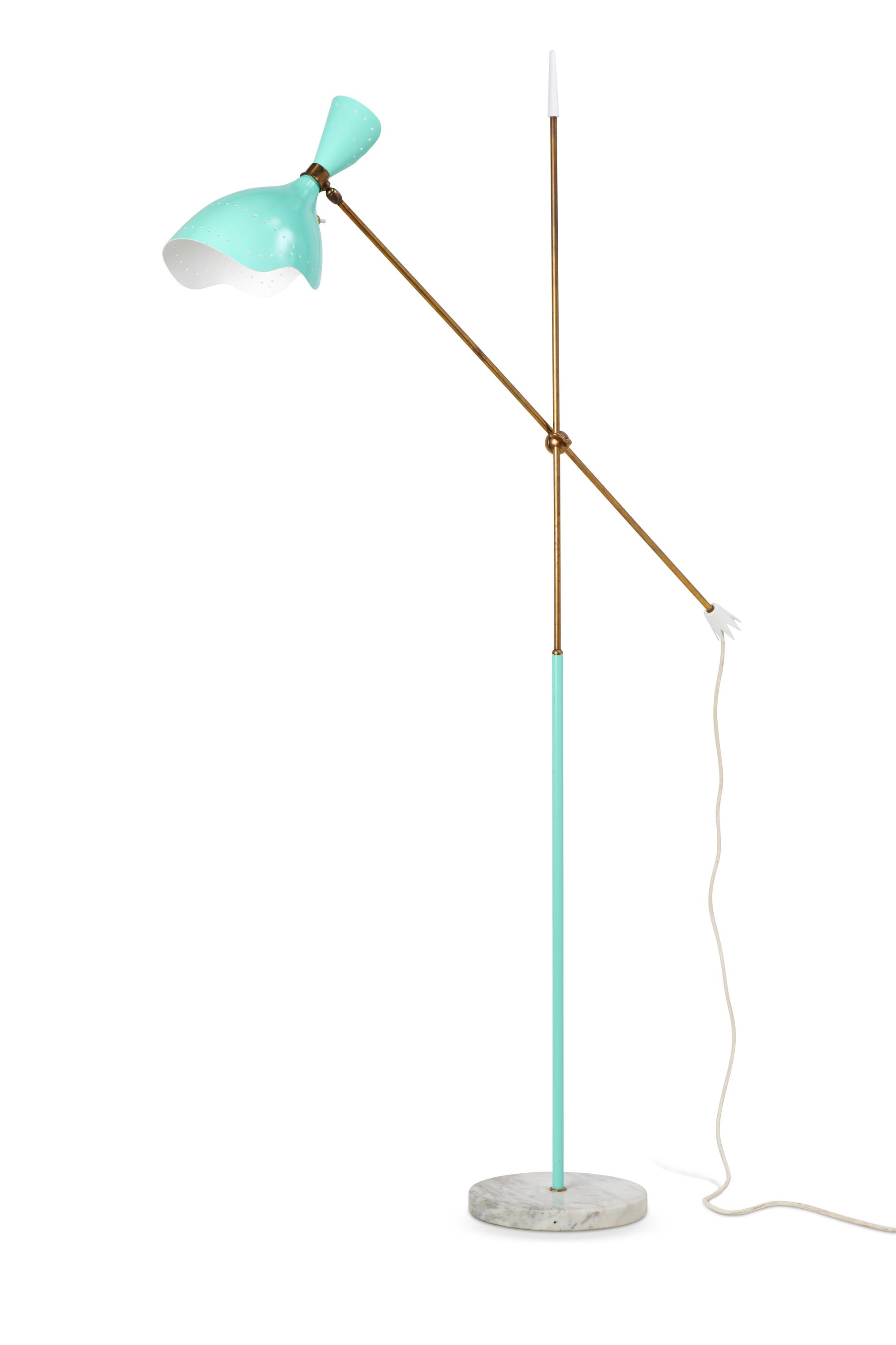 Minor surface scratches to marble base and slight fading to brass patina consistent with age and previous use. The lamp has been restored and re-powder coated in mint green and white.
