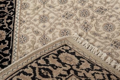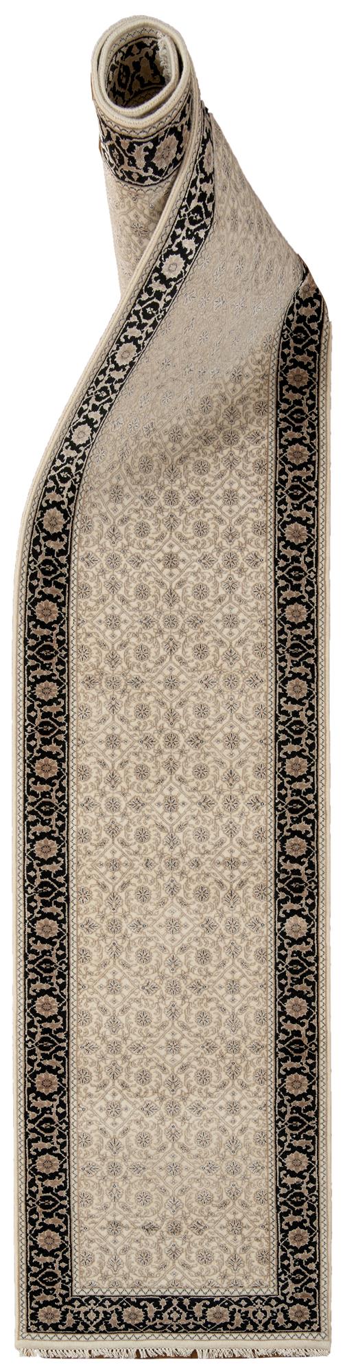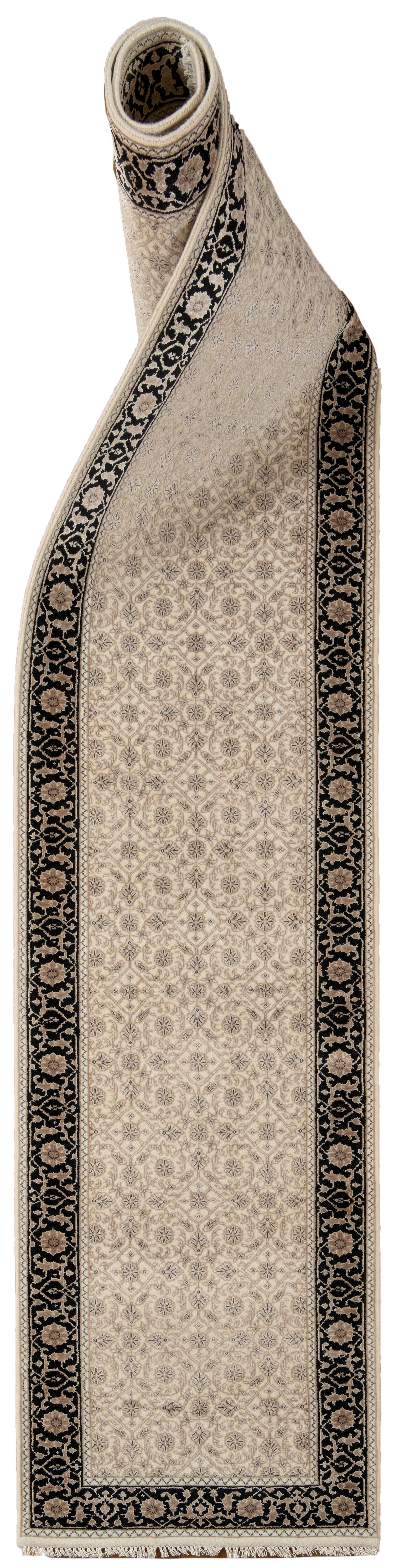 A NEW PERSIAN HERATI DESIGN RUNNER. WOOL AND SILKY DENSE TEXTURE. HAND KNOTTED, IN TONES OF BLACK AND IVORY. VERY SOLID HALL RUNNER – GOOD FOR HIGH TRAFFIC. SIZE: 396 X 76 CM ORIGIN: JAIPUR – RRP: $2,900 DOCUMENTATION OF AUTHENTICITY INCLUDED.