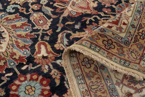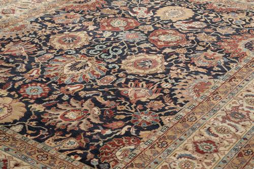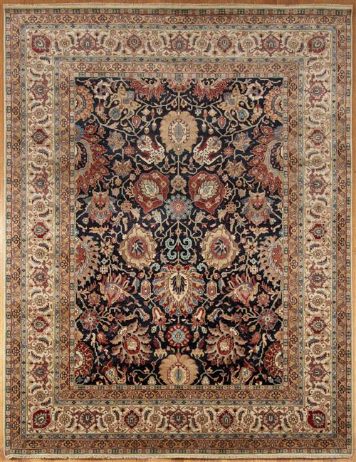 A NEW PRISTINE & MOST ATTRACTIVE PERSIAN SERAPI DESIGN RUG. VERY FINELY HAND-KNOTTED WITH THE FINEST 100% HAND SPUN WOOL AND NATURAL DYES. AN ALL-OVER DESIGN OF LARGE PALMETTES, TULIPS AND ROSETTES. THE CARPET IS PERFECTLY BALANCED IN COLOUR & DESIGN IN TONES OF RUST, LIGHT BLUE, BEIGE, AND INDIGO BLUE. SIZE: 235 X 307 CM RRP $7,800 ORIGIN: AGRA TAJ MAHAL PROVINCE DOCUMENTATION OF AUTHENTICITY INCLUDED.