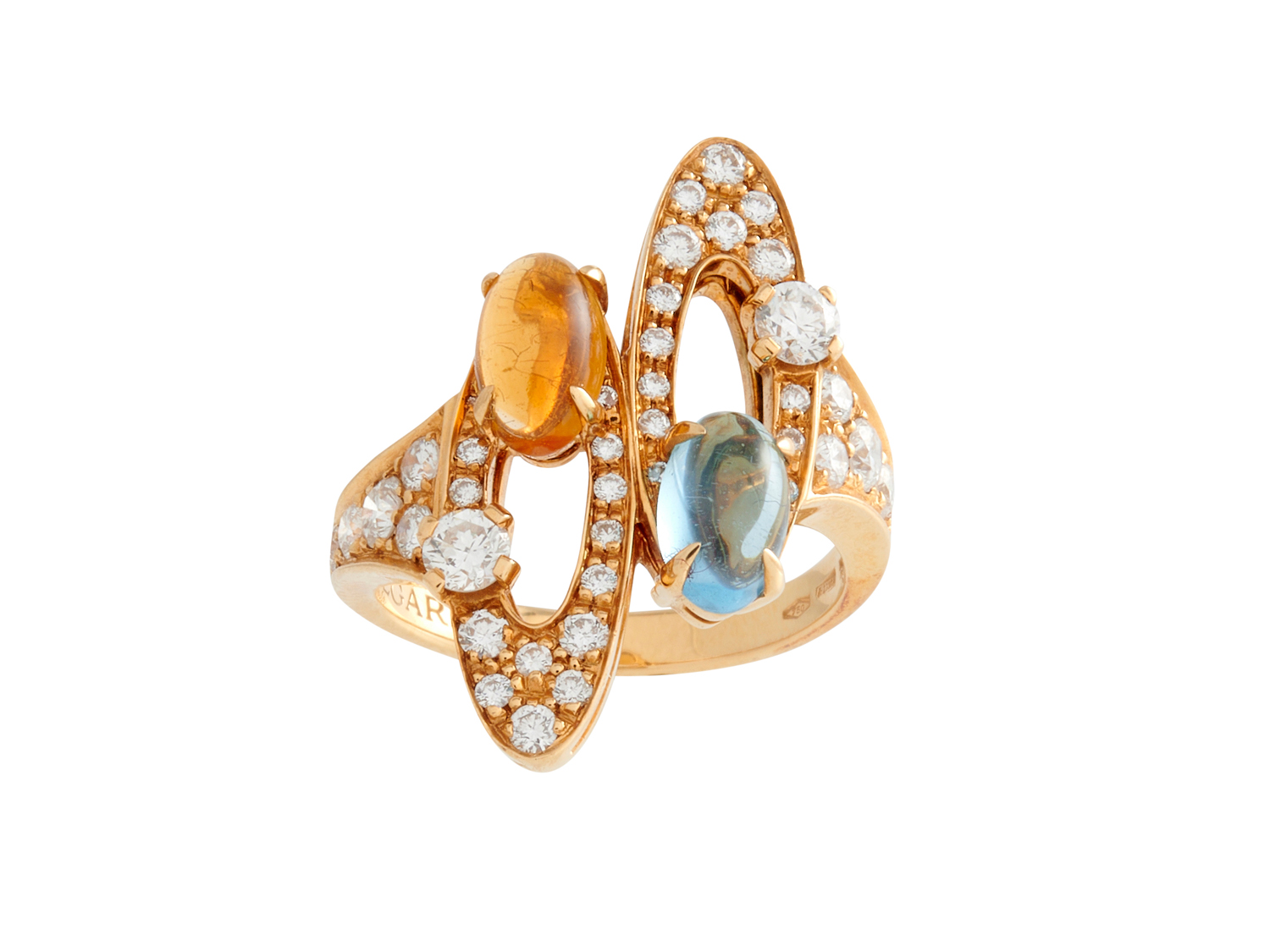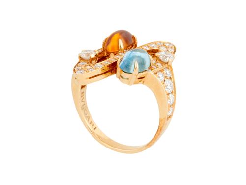 Comprising two elliptical pavé-set plaques embellished with brilliant-cut diamonds and oval cabochon topaz and citrine, to tapered diamond-set shoulders, the diamonds together weighing approximately 1.80 carats, signed Bulgari, size N 1/2.