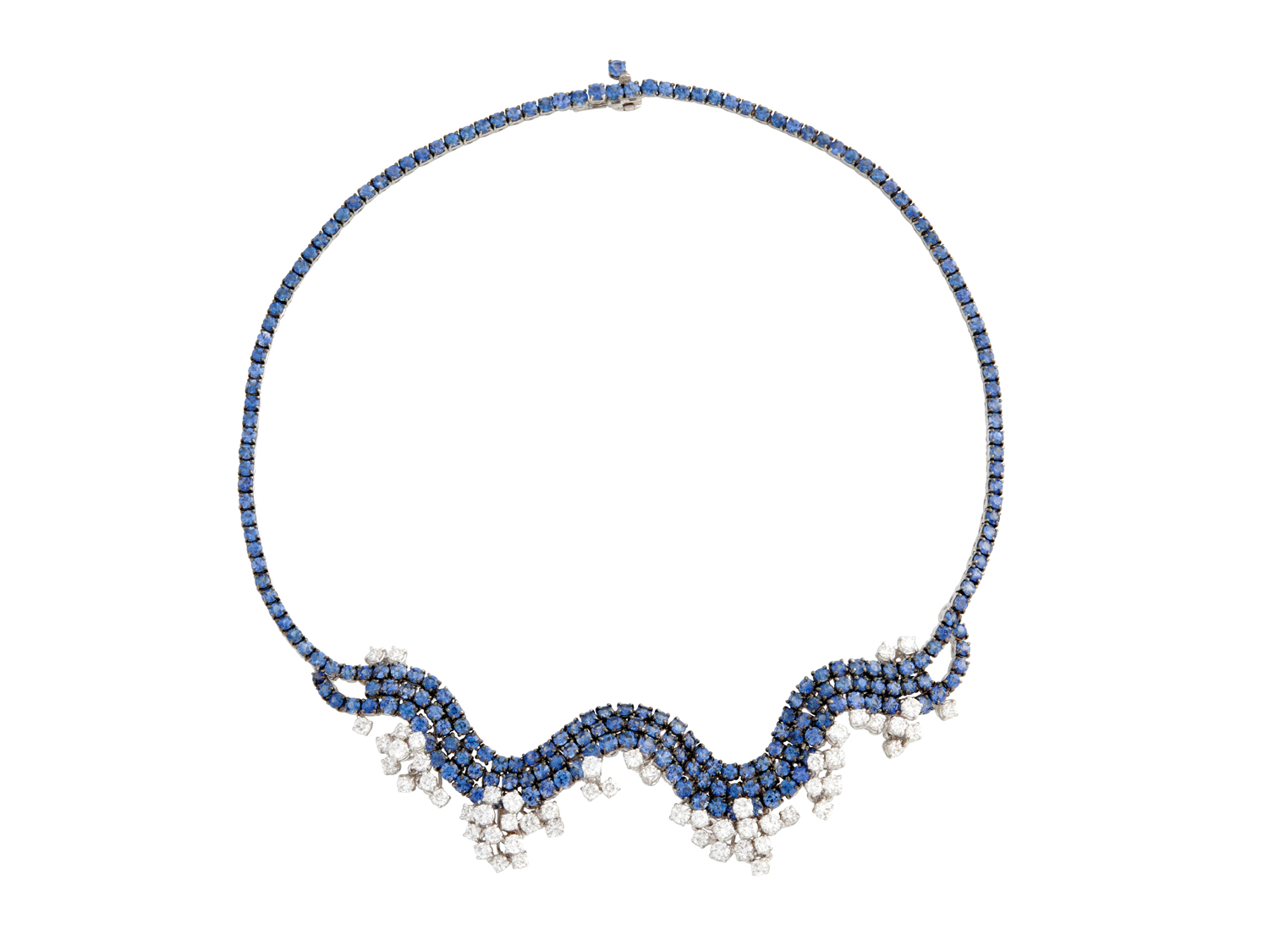 Designed as a continuous line of circular-cut sapphires culminating in a triple row wave motif detailed with brilliant-cut diamond accents, the diamonds together weighing approximately 5.80 carats, completed by a concealed box clasp, signed Damiani, Italian marks, length approximately 360mm, gross weight approximately 39.0 grams.