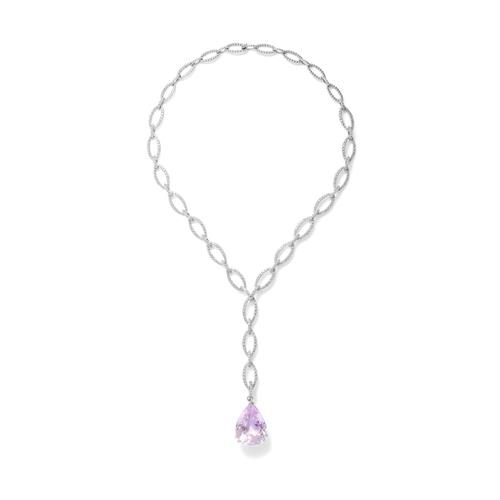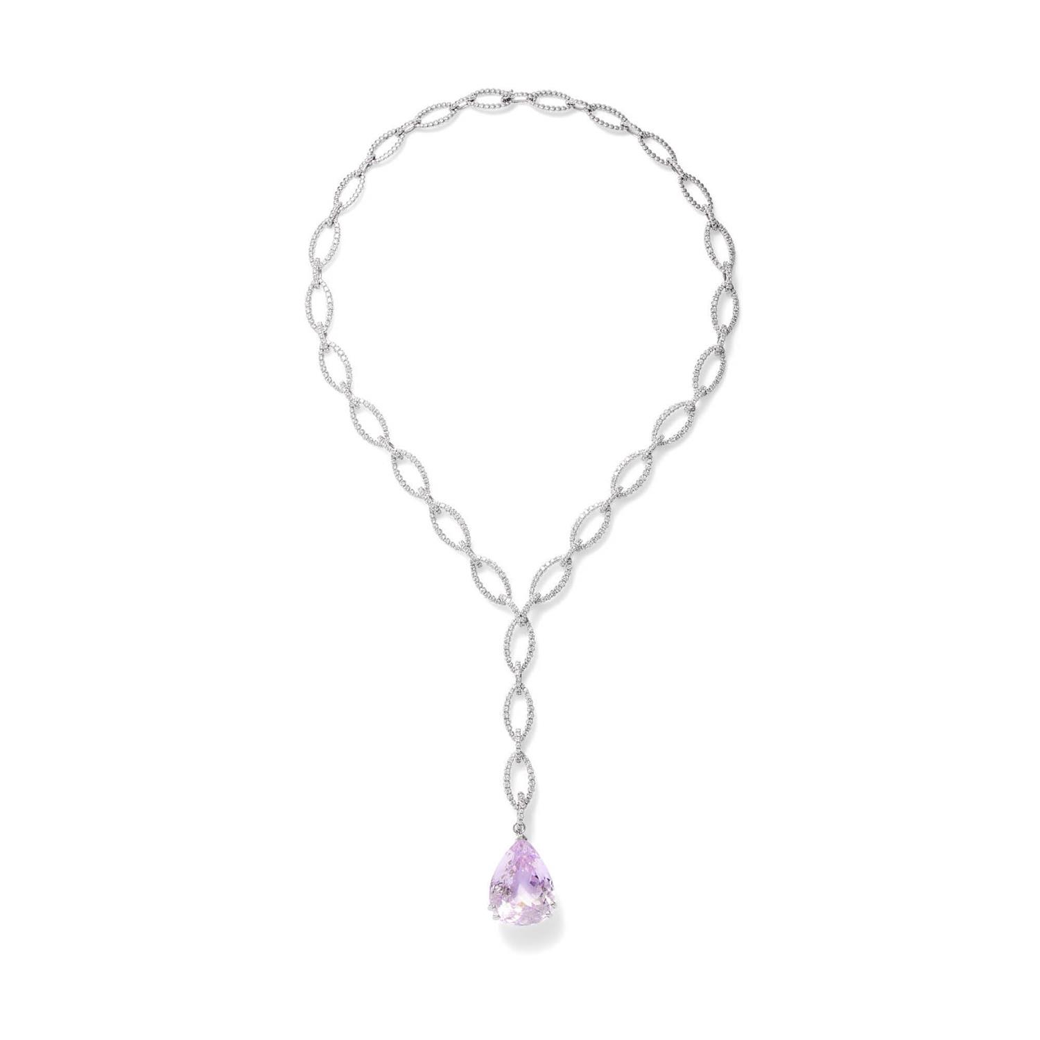 Terminating on a detachable claw-set pear-shaped kunzite weighing approximately 34.65 carats, suspended by a chain of alternating large and small lozenge-shaped links pavé-set with brilliant-cut diamonds, the small diamonds together weighing approximately 4.65 carats, mounted in 18ct white gold, pendant drop 90mm, inner circumference 430mm.