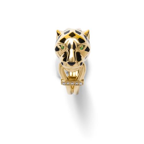 Modelled as a panther head applied with black lacquer spots, accented by pear-shaped tsavorite garnet set eyes and an onyx set nose, to a split wire hoop pavé-set at one end with a line of five brilliant-cut diamonds together weighing approximately 0.05 carats, size 52 (M), numbered Mxxxx0, French assay and maker's marks, signed Cartier.