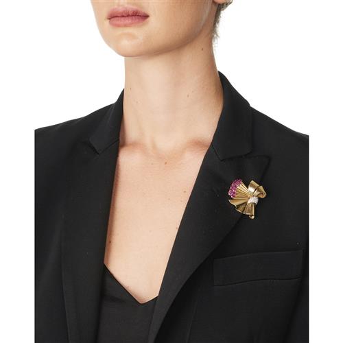 Designed as a stylised ribbon-bow centring a crescent-shaped plaque pavé-set with brilliant-cut diamonds terminating on fan-shaped plaque claw-set with circular-cut rubies, the diamonds together weighing approximately 0.60 carats, length 42mm, width 37mm, trombone clip fitting, numbered 4xxx6, maker's marks, signed Tiffany & Co., Made in France.