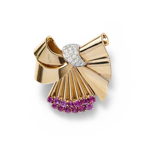 TIFFANY & CO. 14CT GOLD, RUBY AND DIAMOND BOW BROOCH, CIRCA 1945