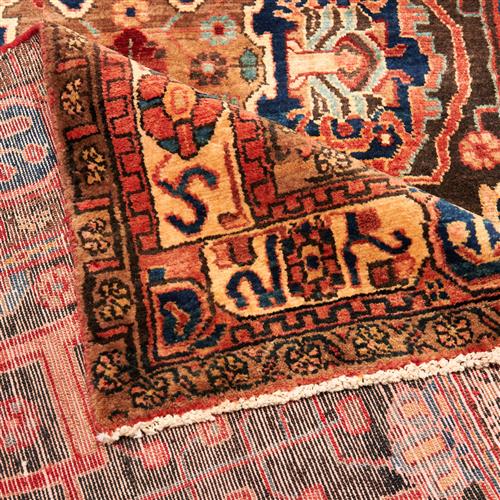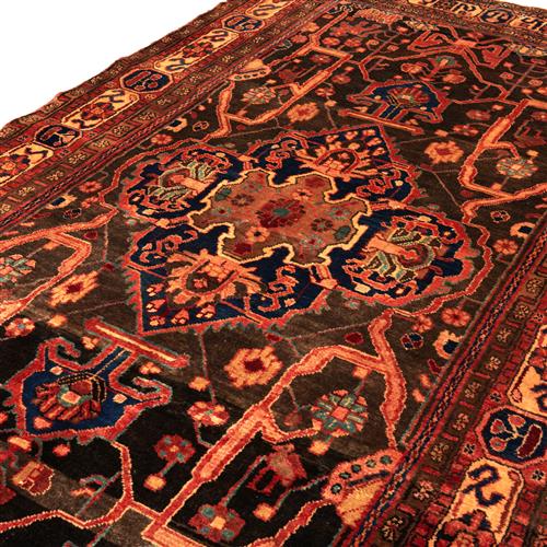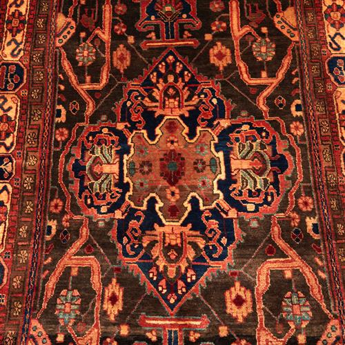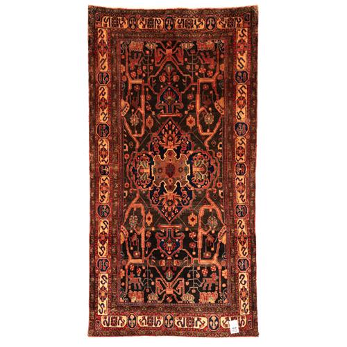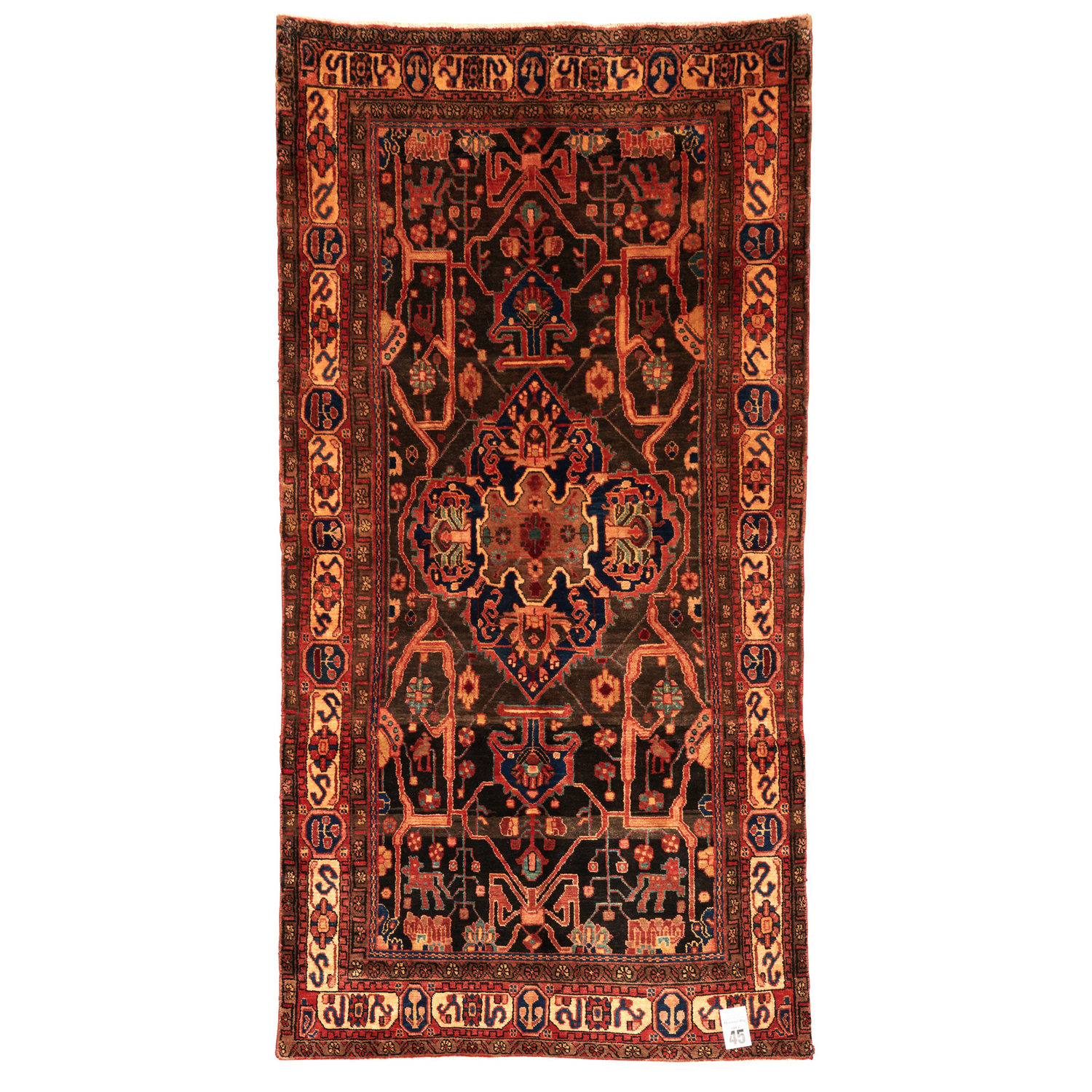 A PERSIAN NOMADIC NAHAVAND RUG. 100% HAND SPUN WOOL, NATURAL DYES. HAND-KNOTTED VILLAGE WEAVE WITH DESIGN OF CENTRAL ANCHORED STYLIZED MEDALLION SET WITHIN A FIELD OF VARYING FLORAL, GEOMETRIC MOTIFS. VIBRANT ALL OVER COLOURS. BORDER OF CARTOUCHES FILLED WITH FLORAL SHRUBS; GEOMETRIC PATTERNS. NATURAL ABRASH. SIZE: 275 X 144 CM ORIGIN: PERSIA – RRP: $2,600 DOCUMENTATION OF AUTHENTICITY INCLUDED