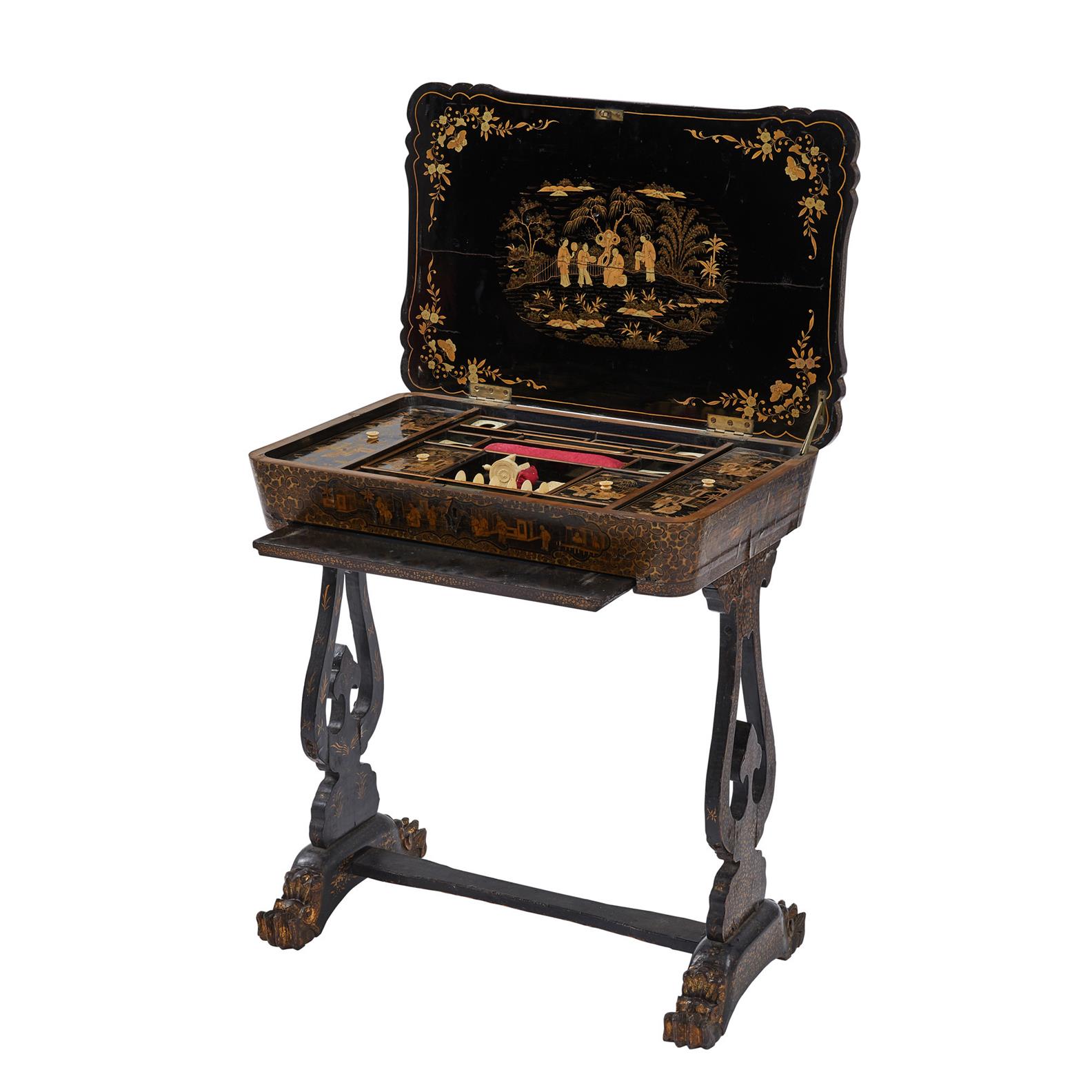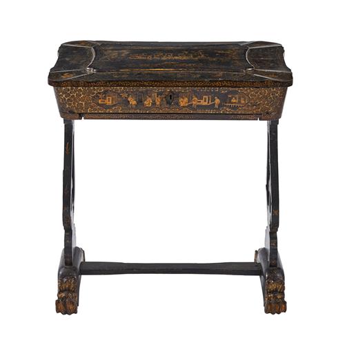 Early 19th century, decorated all over in gold on a black ground with scenes from daily life, the rising top revealing a fitted interior with original bone implements, above a slide for work bag, on baluster shaped end supports joined by a stretcher terminating in lion paw feet.
