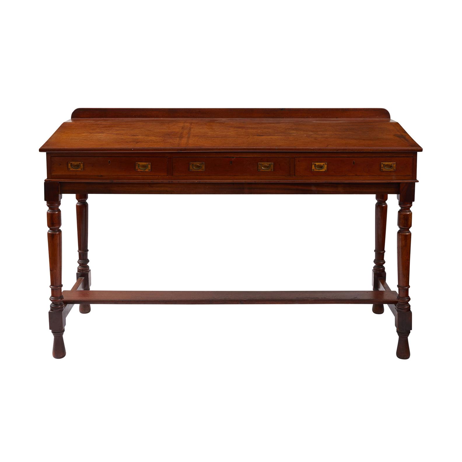 The sloped top above three frieze drawers with recessed brass handles on a stand with turned tapering legs joined by a broad stretcher.