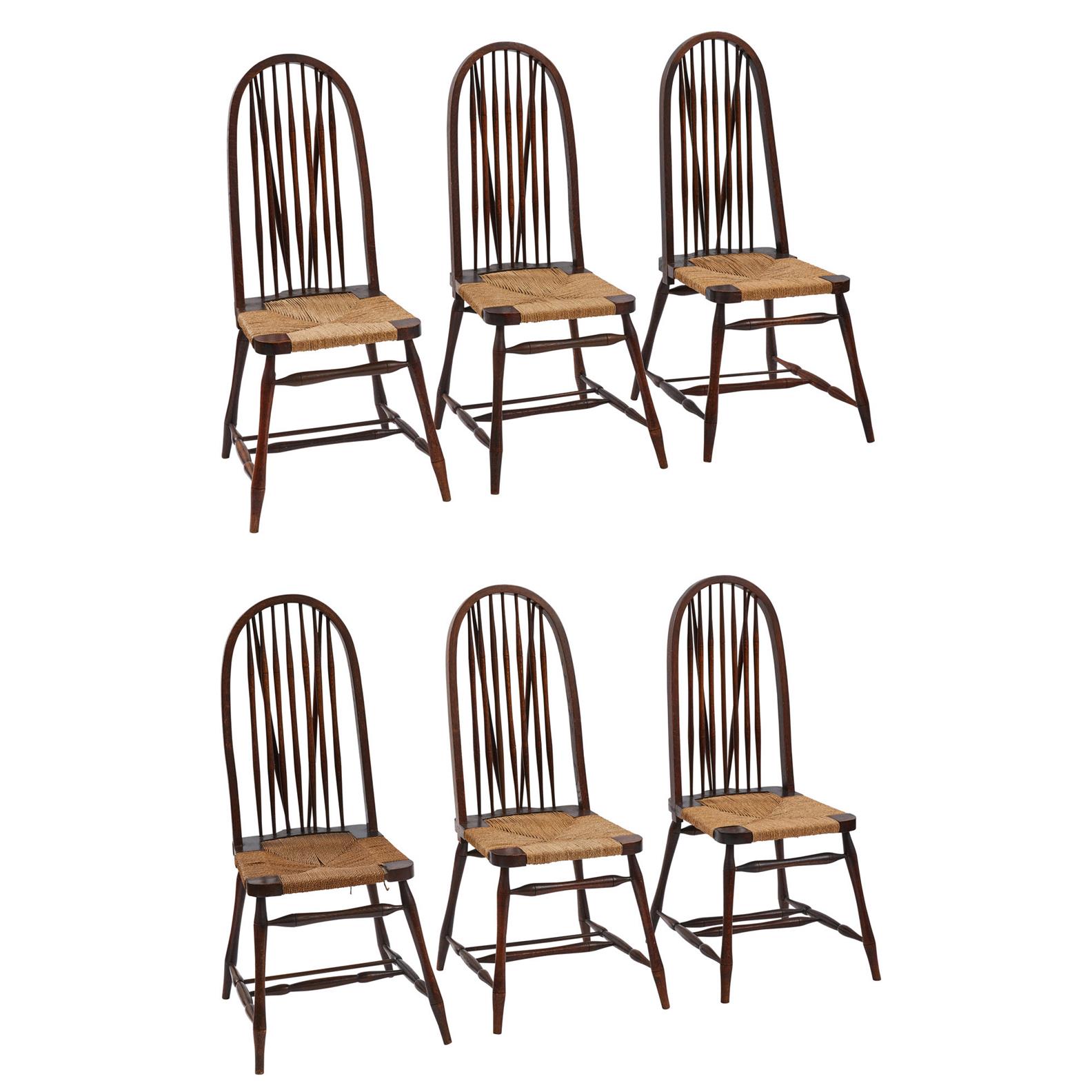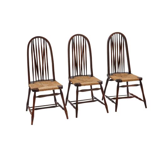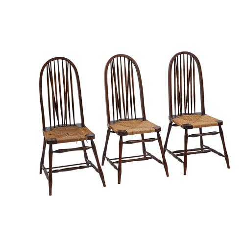 Each with an arched back with nine turned stick supports above a rush seat on turned legs joined by stretchers.