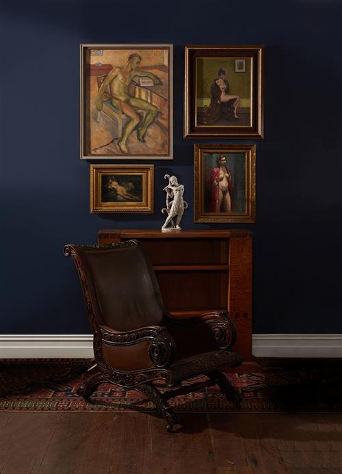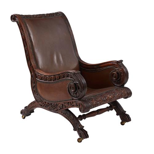 Early 19th century, the relief carved top rail centred with a palmette and flanked by acanthus scrolls, the reeded uprights with leaf carved sides, the leather upholstered back and seat flanked by foliate scrolled arms on outswept front and back legs with paw feet, turned and lotus carved stretchers.
