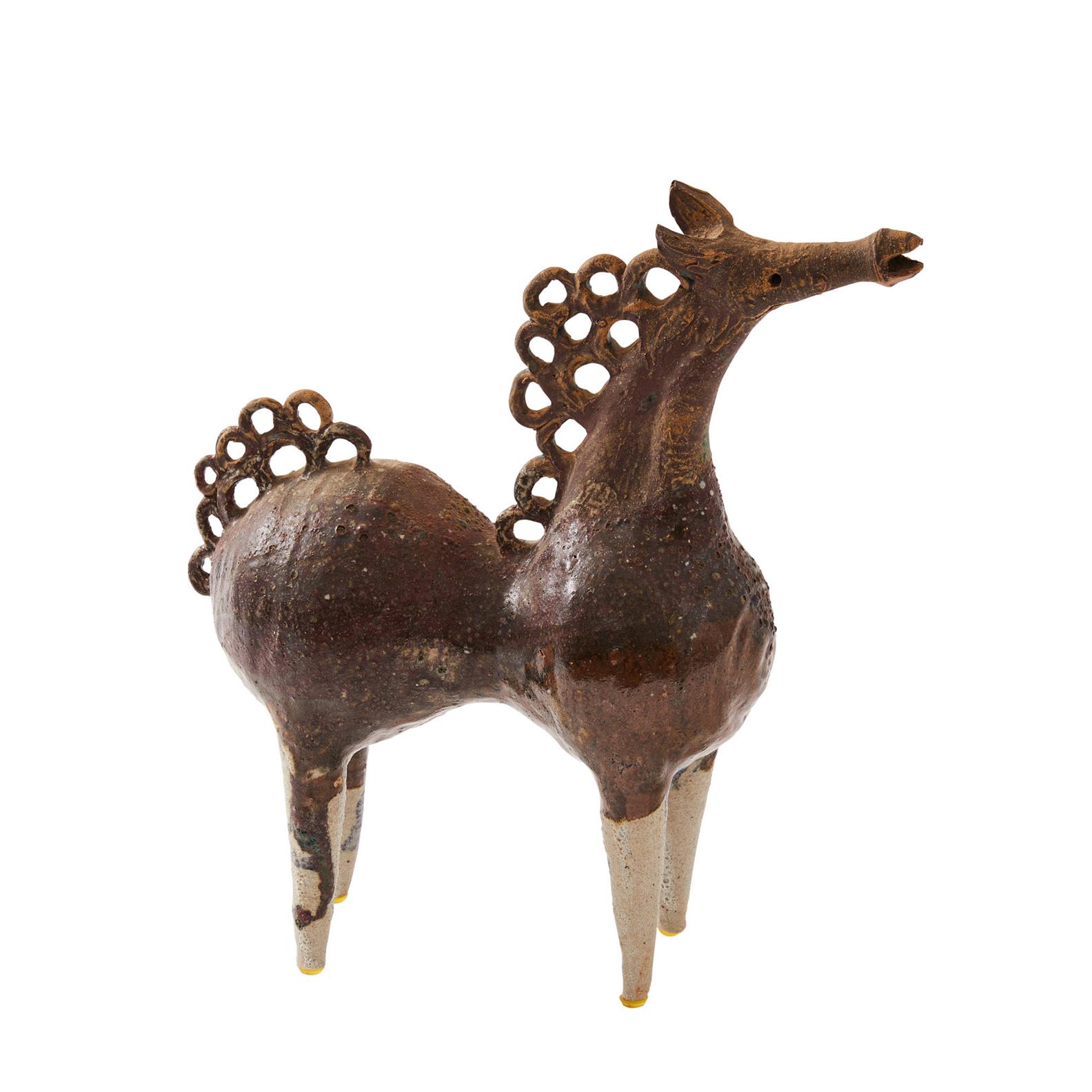 The equine with double gourd-shaped body standing on all four legs with head held high and mouth ajar, glazed in brown, artist's signature incised to underside.