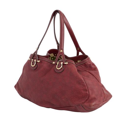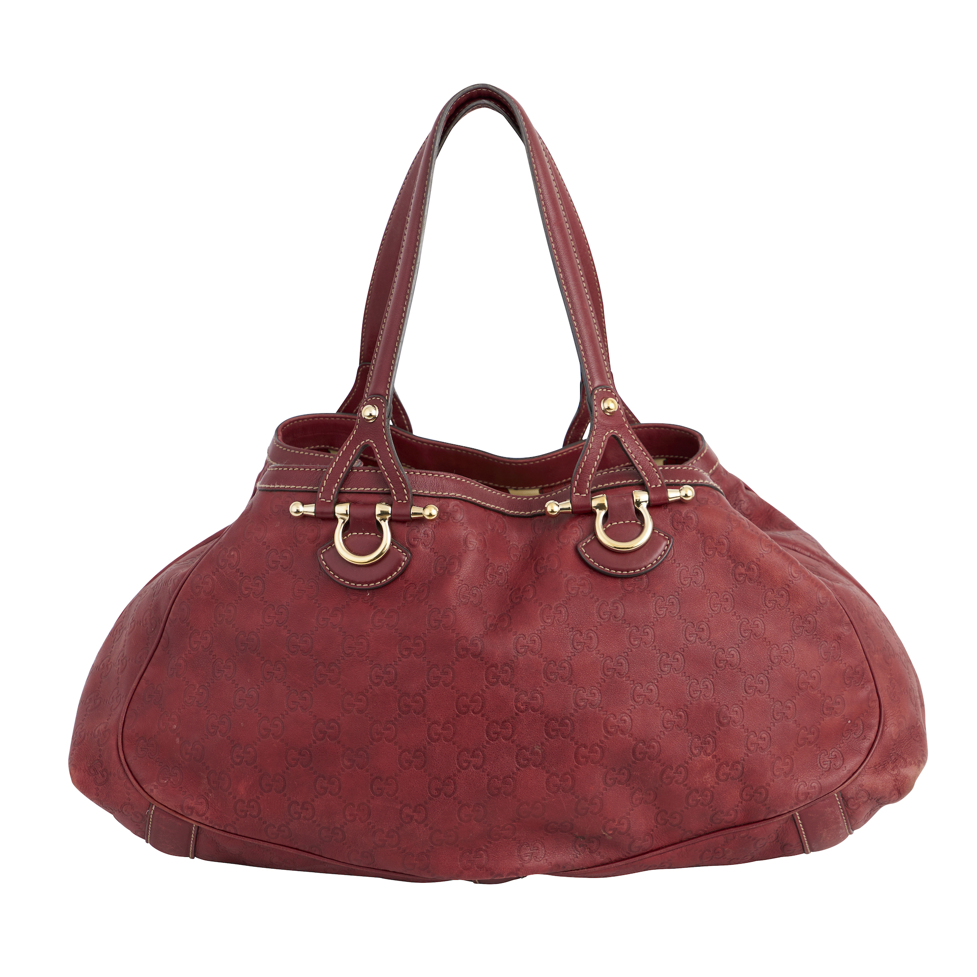 Styled in plum red Supreme Monogram embossed leather with gold tone hardware, featuring internal zip pocket and dual leather shoulder straps, 25 x 55 x 23 cm.