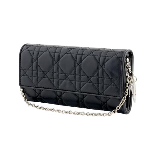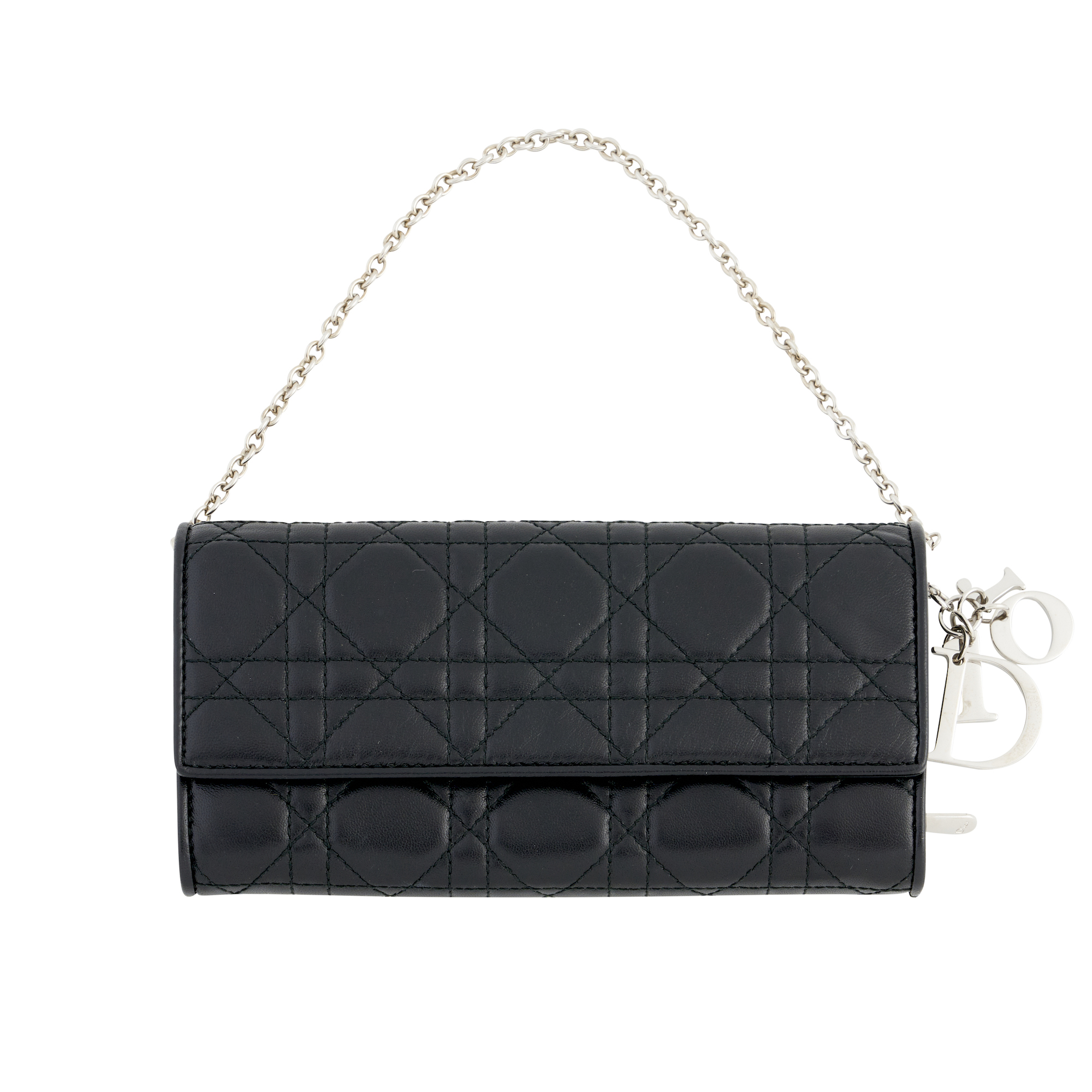 Styled in Canagge lambskin with silver tone chain strap, featuring front flap closure and Dior logo charm, 19 x 9.5cm.