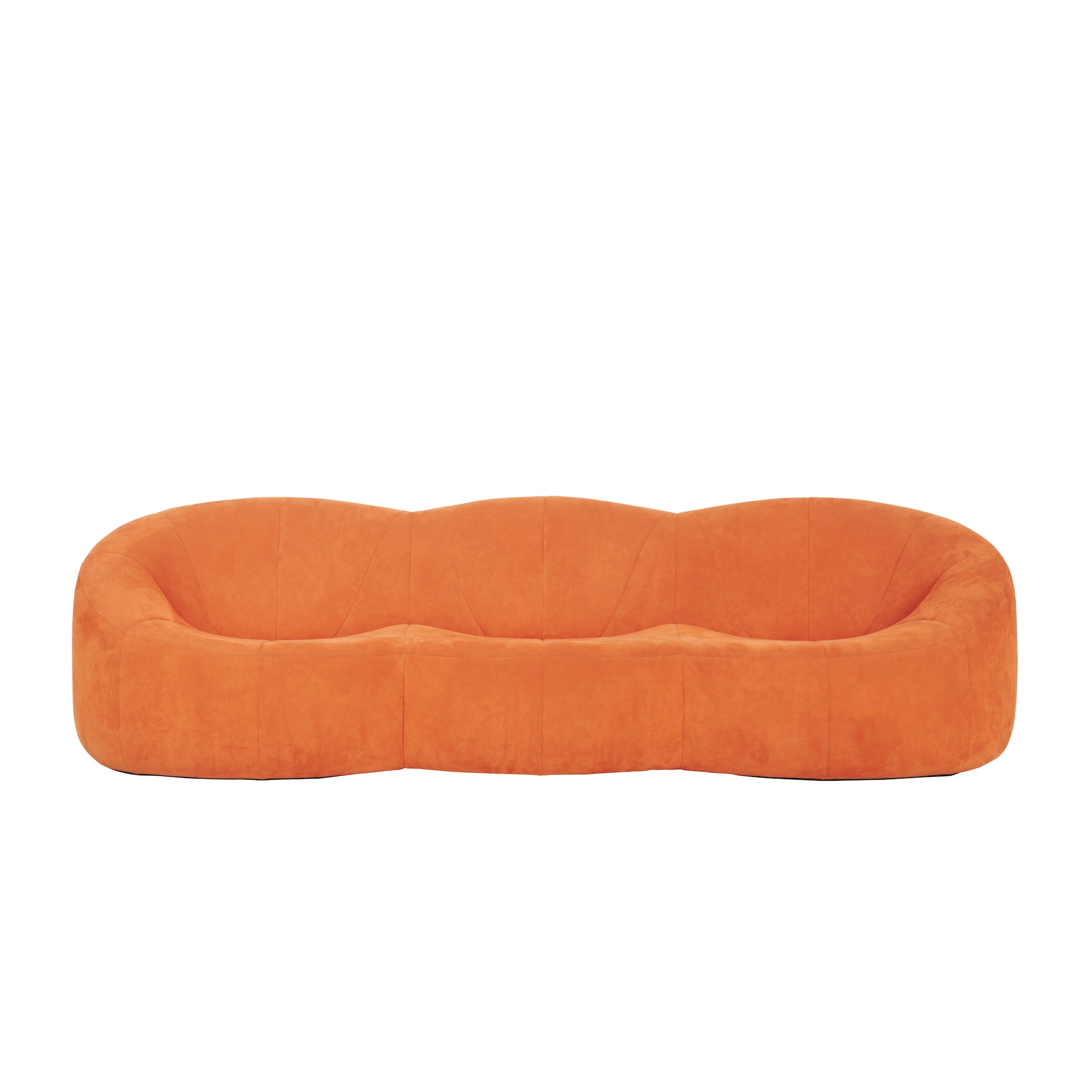 Organically formed three-seat sofa with an enveloping, bucket-style back. Orange textile upholstery.