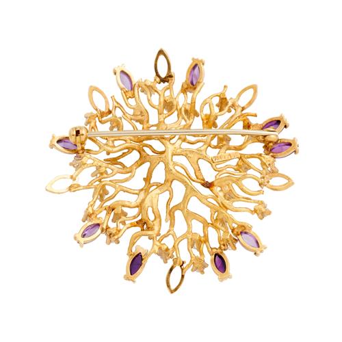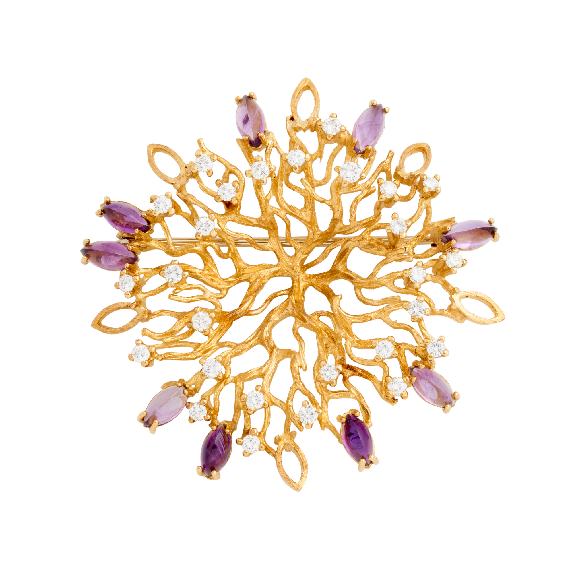 Of abstract organic design, claw-set with round brilliant-cut diamonds and marquise-cut amethysts, diameter 45mm, gross weight approximately 14.2 grams.