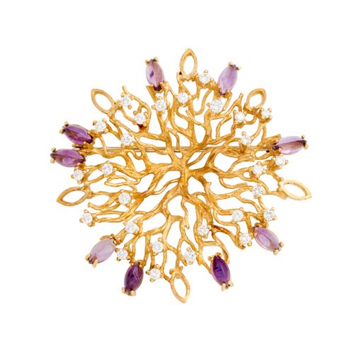 18CT GOLD, AMETHYST AND DIAMOND BROOCH