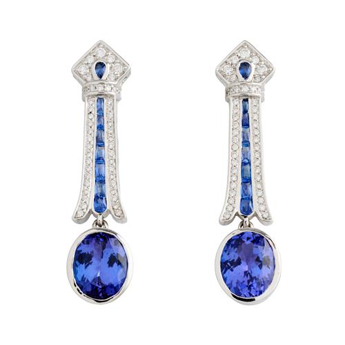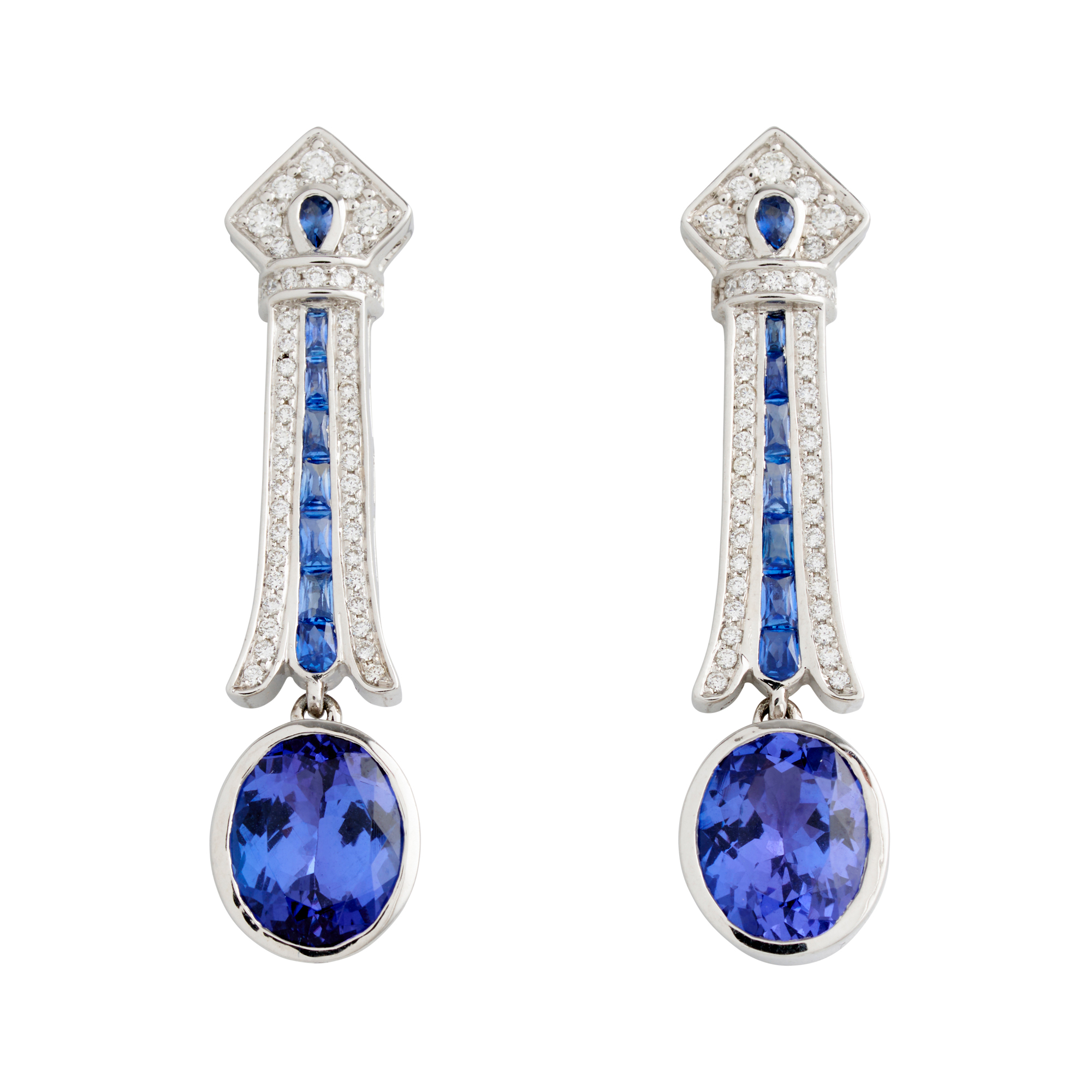 Each earring comprising a collet-set oval-cut tanzanite, suspended below a peaked elongated drop embellished with tapered carre-cut sapphiress flanked by grain-set brilliant-cut diamonds, to a diamond shaped sapphire and diamond cluster surmount, the tanzanites together weighing approximately 4.00 carats, the diamonds together weighing approximately 0.40 carats, to post and butterfly fittings, length 40mm, gross weight approximately 9.5 grams.