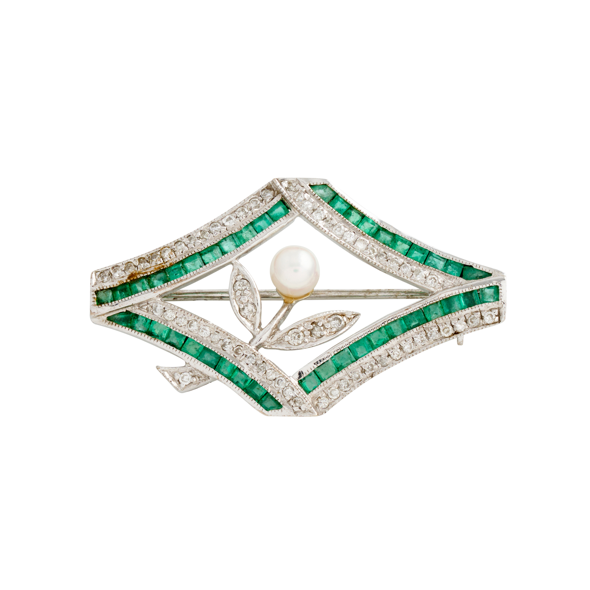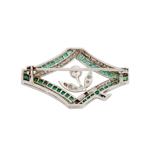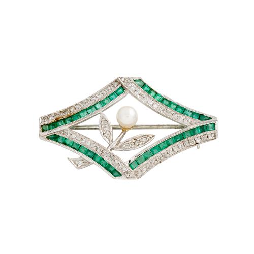 Of open lozenge shaped design, centring a diamond and cultured pearl floral motif, within a border of carre-cut emeralds and single-cut diamonds,
