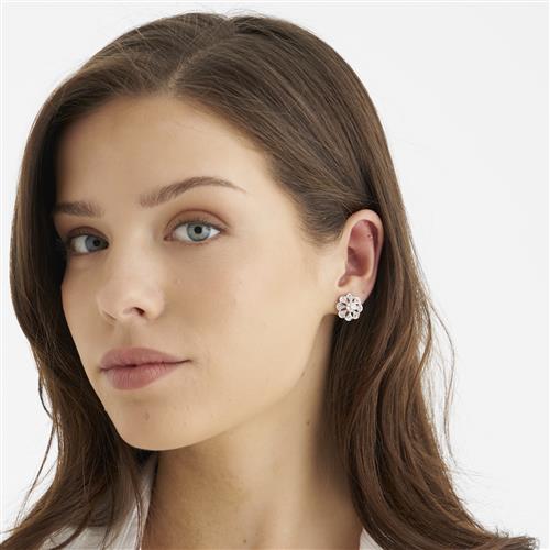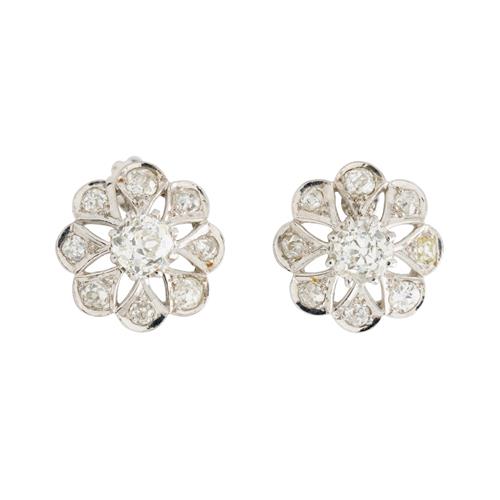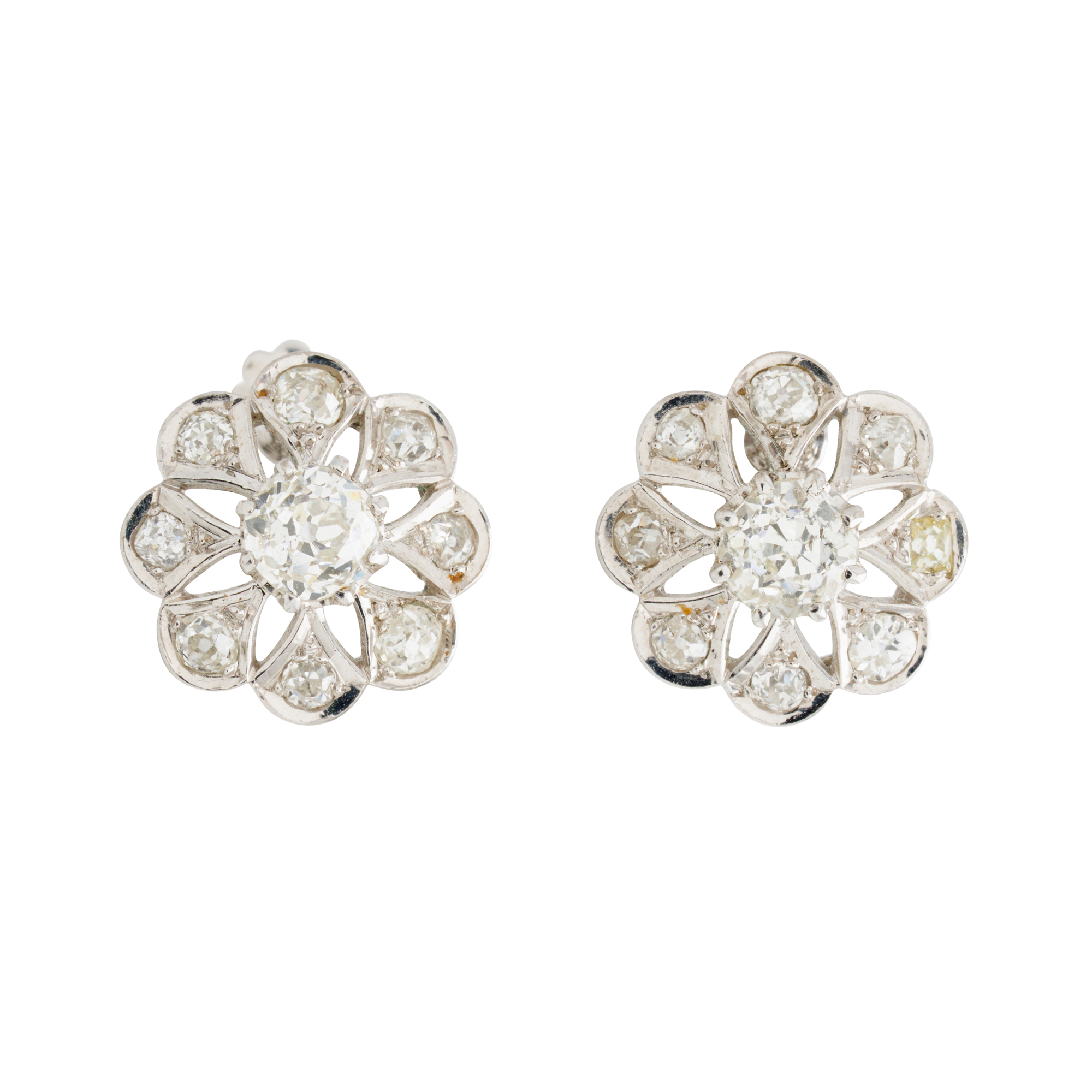 Each earring modelled as a floral cluster, centring a claw-set old European-cut diamond within a pierced surround of further diamonds, the diamonds together weighing approximately 1.15 carats, to screwback fittings, diameter 14mm, gross weight approximately 5.8 grams.