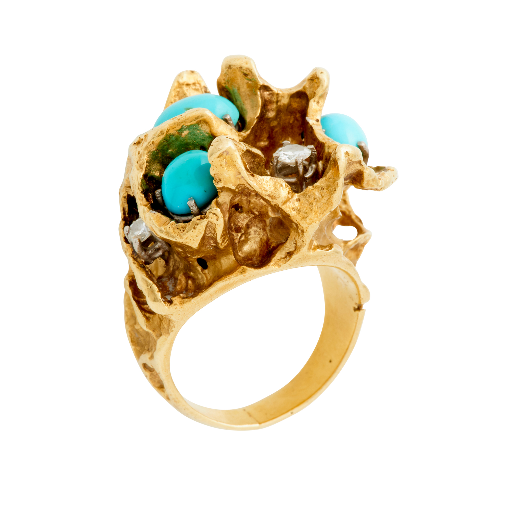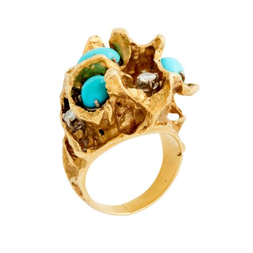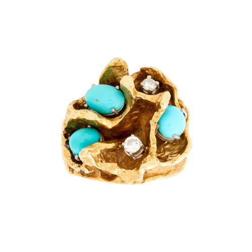 Of abstract design, detailed with three claw-set oval cabochon turquoise and three claw-set brilliant-cut diamonds, size O, gross weight approximately 29.2 grams.