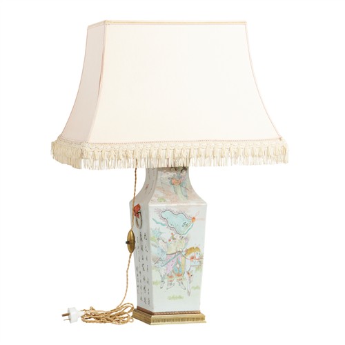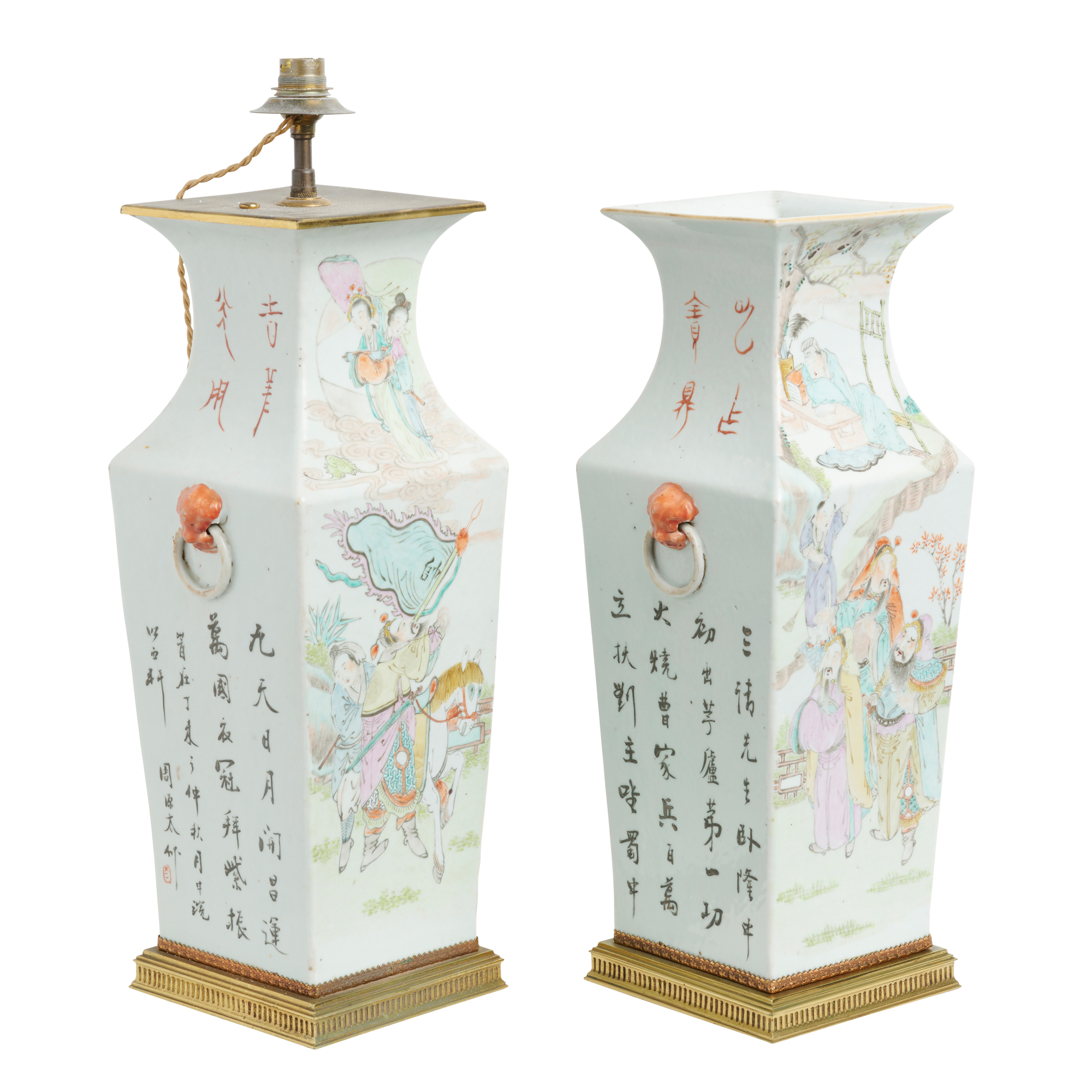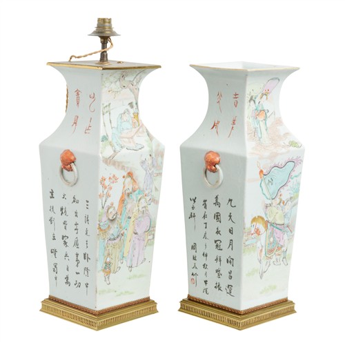 Each of square outline with a waisted neck and tapering towards the base, a pair of applied mask and ring handles below the shoulders, decorated on opposing sides with scenes of figures engaged in various activities, the other sides with inscriptions, on later gilt metal bases, one presently mounted as a lamp with shade (not drilled)