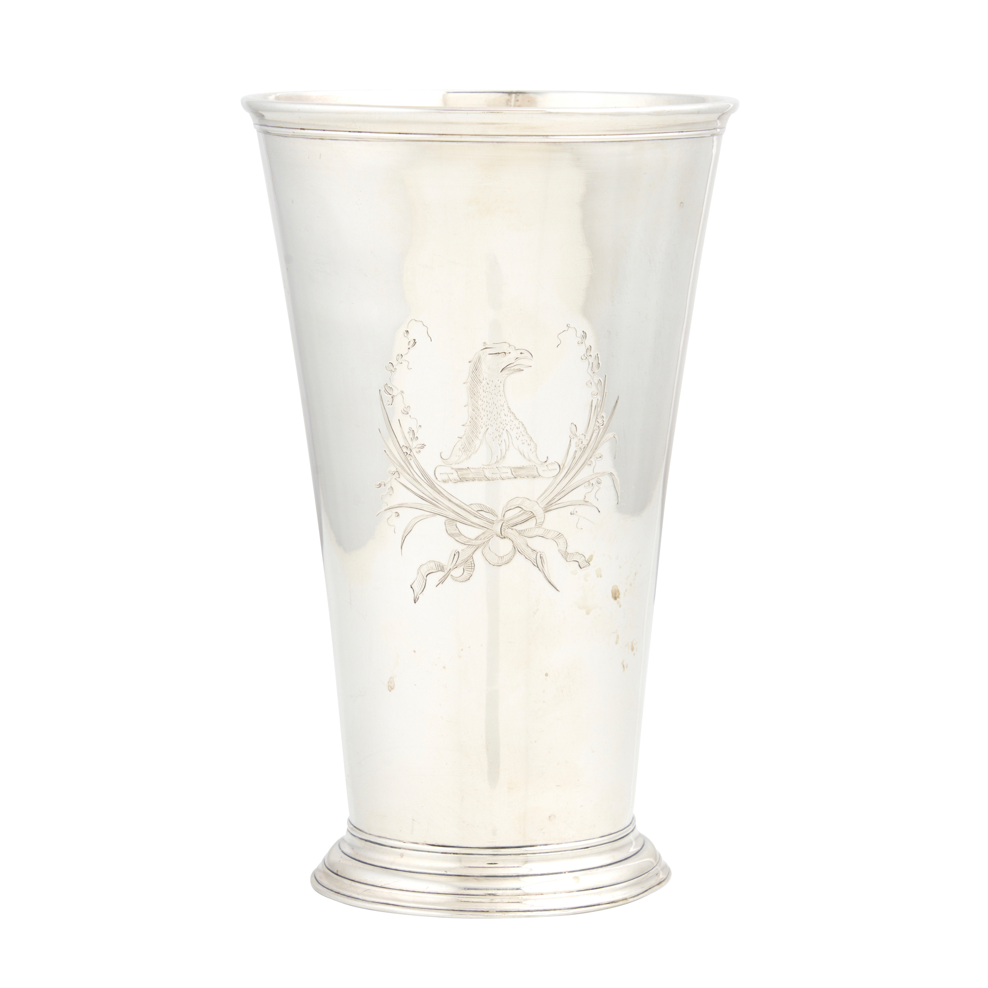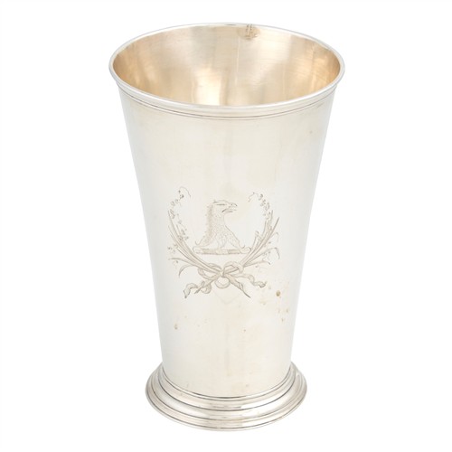 Of tapering form with a moulded rim and standing on a moulded foot, engraved to one side with a couped eagle's head crest within a ribbon-tied spray of foliage