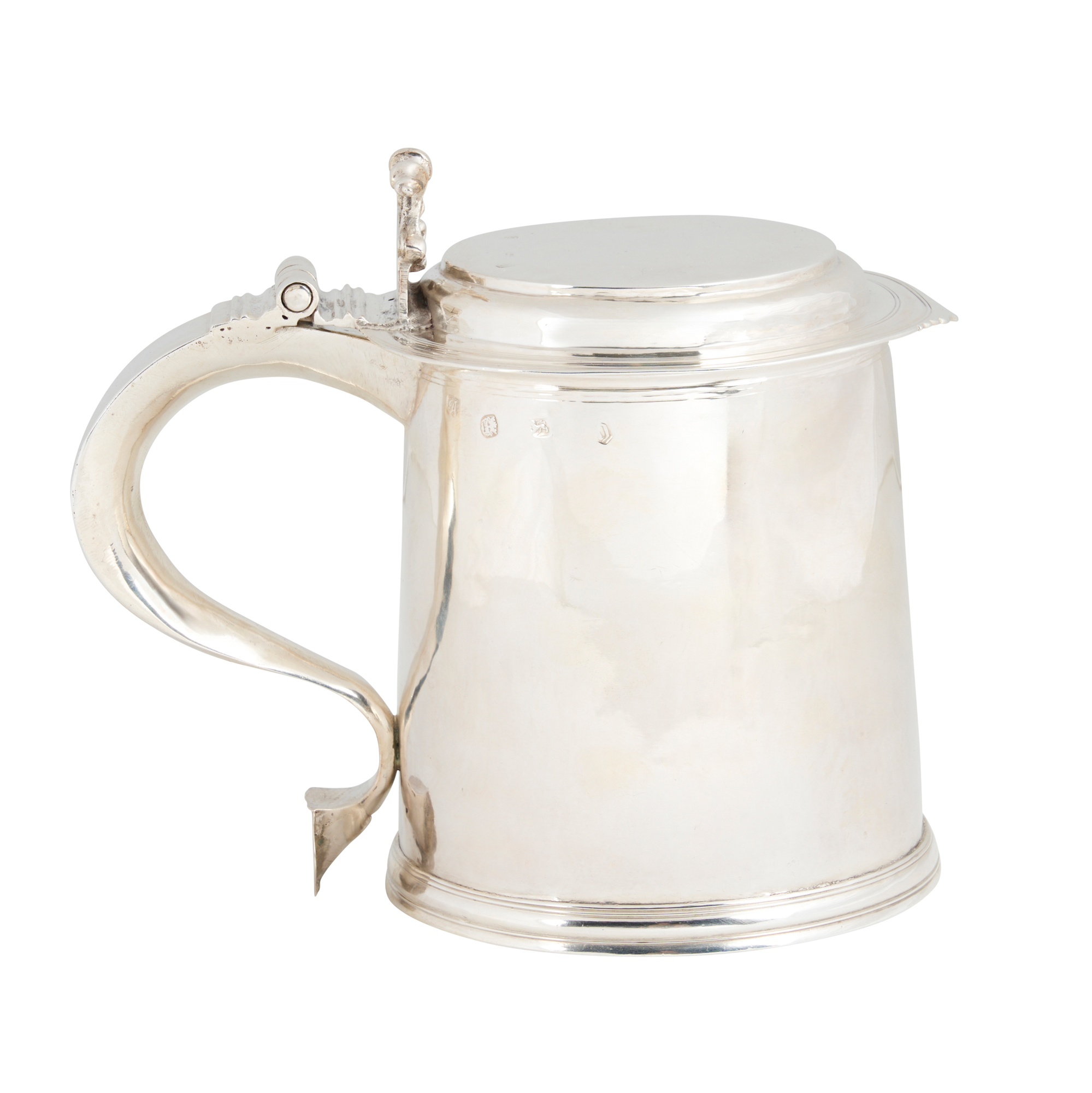 Of spreading cylindrical shape on a moulded foot, the hinged flat cover with moulded edge, shaped beak, and corkscrew thumbpiece, the scroll handle with shaped terminal