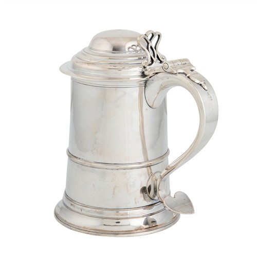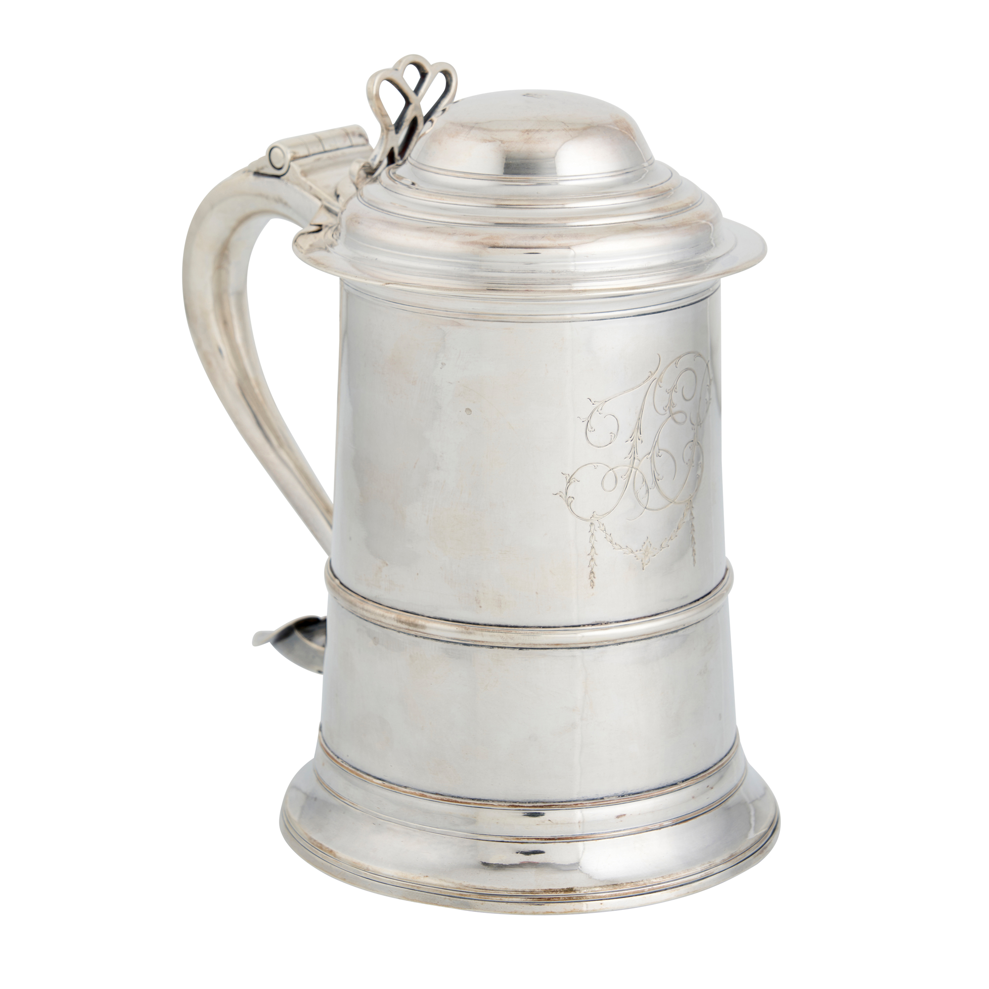 The spreading cylindrical girdled body on a spreading moulded foot with a domed and moulded cover with pierced thumbpiece, the scroll handle with a baluster drop and a heart -shaped terminal, the body engraved with initials T E