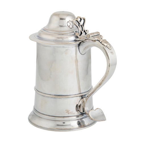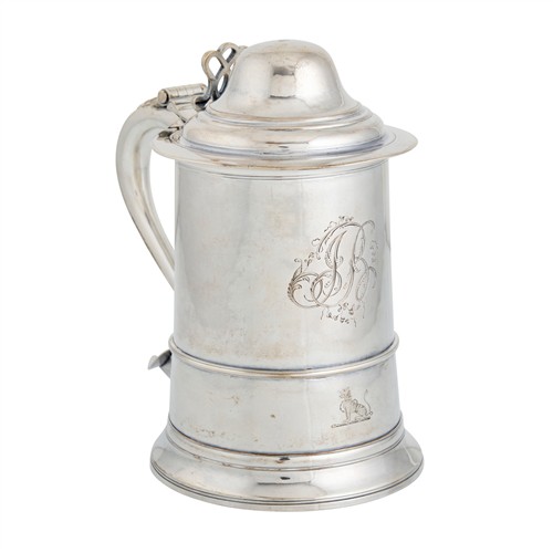 The spreading cylindrical girdled body on a moulded foot with a domed and moulded cover with pierced thumbpiece, the scroll handle with a baluster drop and a heart -shaped terminal, the body engraved with initials J B, a crest of a lion sejant below
