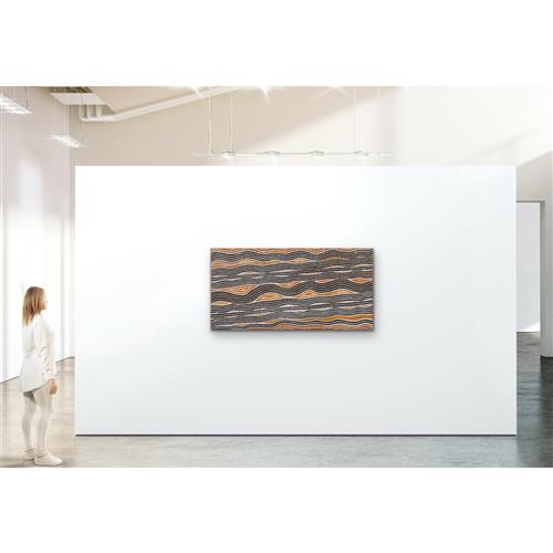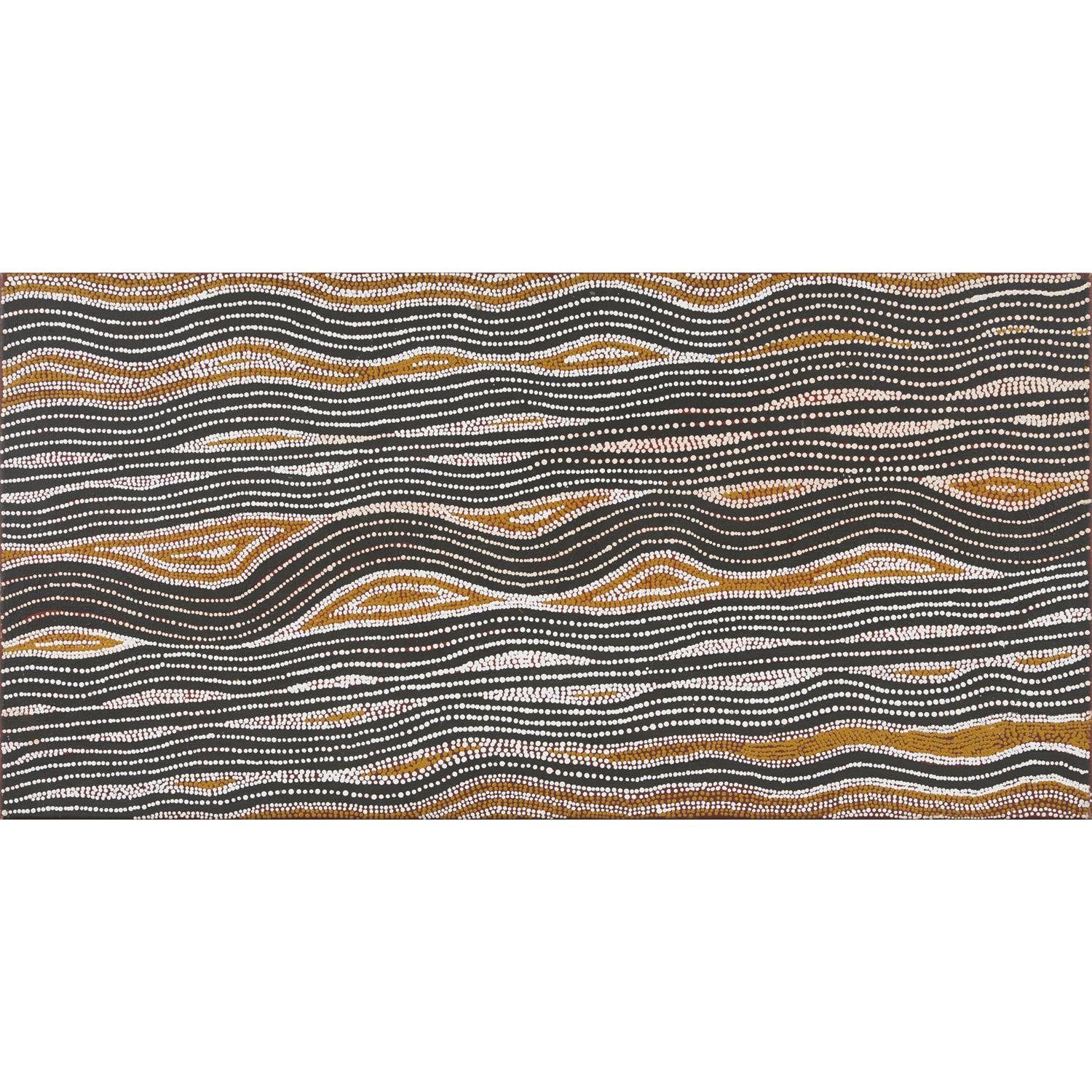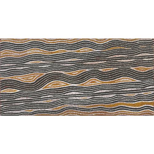 "This painting depicts designs associated with the Snake Dreaming which travelled from Karrinyarra (Mt. Wedge), west to Lake Mackay and then further west to Nyinmi Rockhole and soakage water, just to the east of Jupiter Well. At Nyinmi the snake entered the rockhole where it is said to remain today.