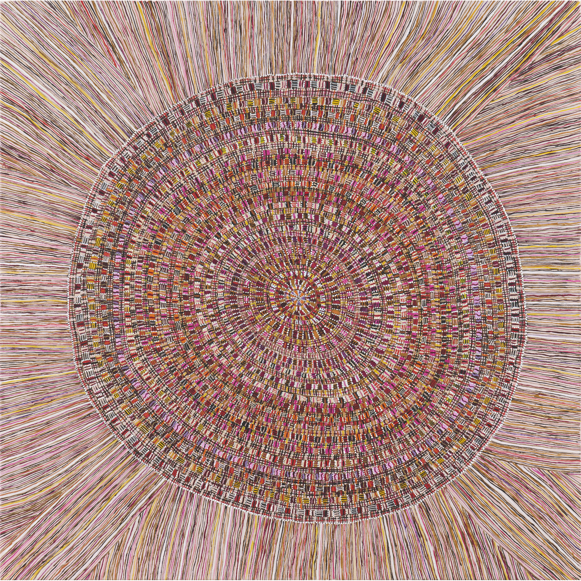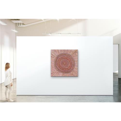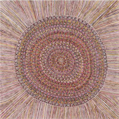 "In this painting Regina has depicted a sun mat, traditionally woven with pandanus by the women of peppimenarti for decorative use"