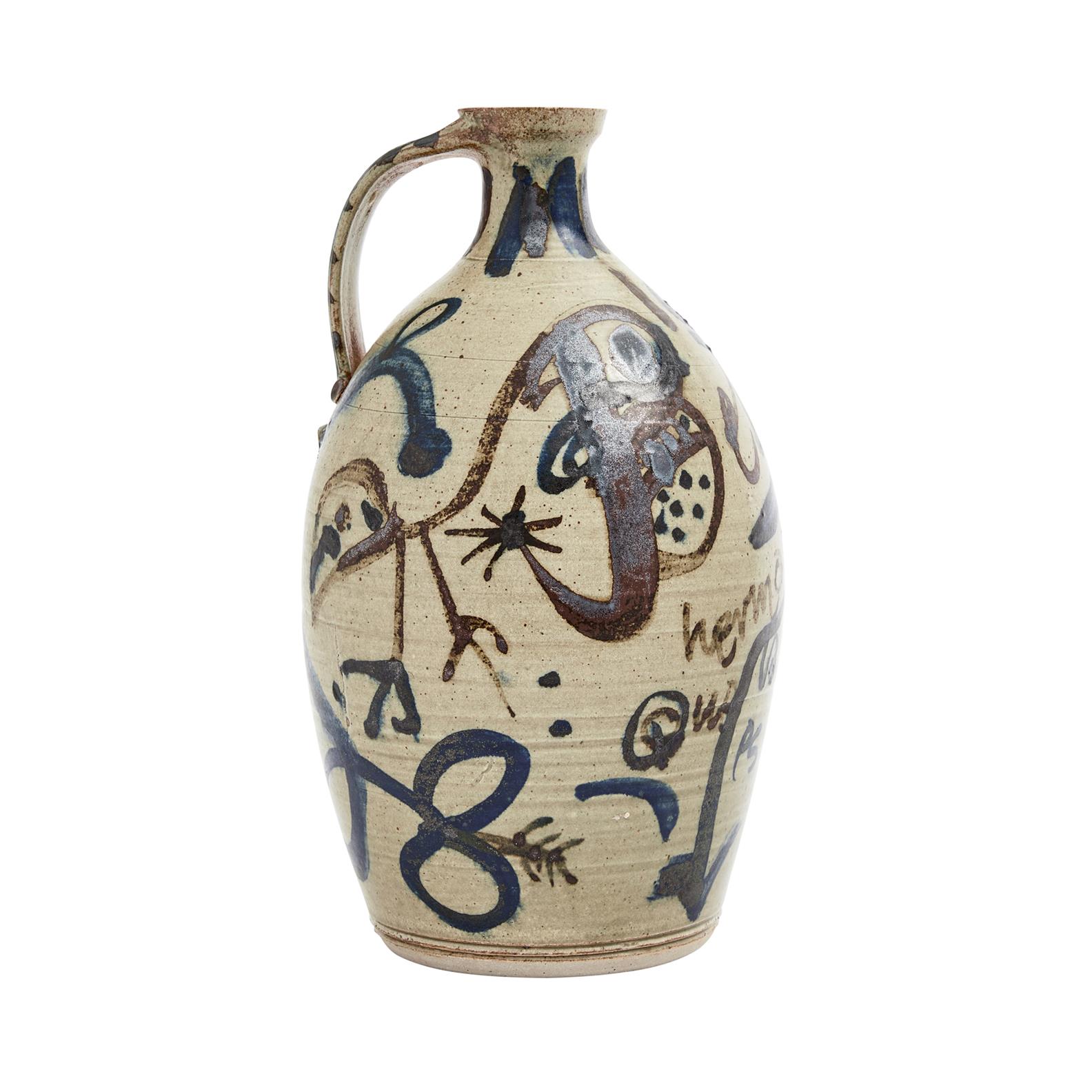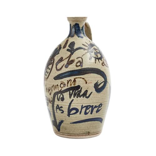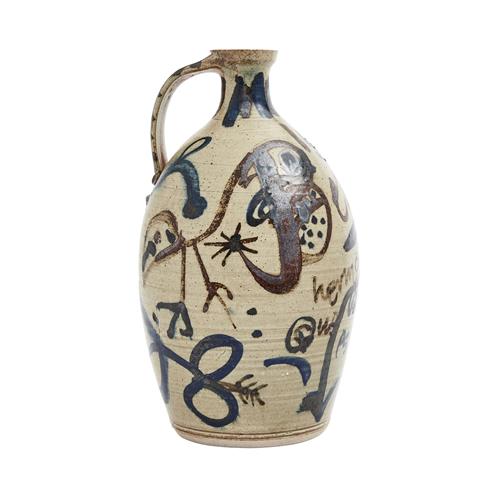 Potted by Robert Mair, decorated in shades of dark brown and blue with stylised designs and Spanish words translating to 'life is short', the globular body with bottle neck and applied handle, impressed potter's mark, title, signature and date to base 'Spanish / life / John Olsen / 70'.