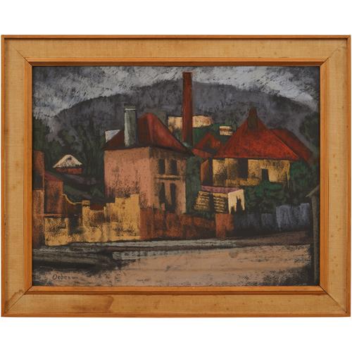 Paper loose/slipped in frame, small loss to upper right corner, pinhole to lower right corner, smudge marks across lower half and diagonally from to left corner, frame in poor condition with no glazing.