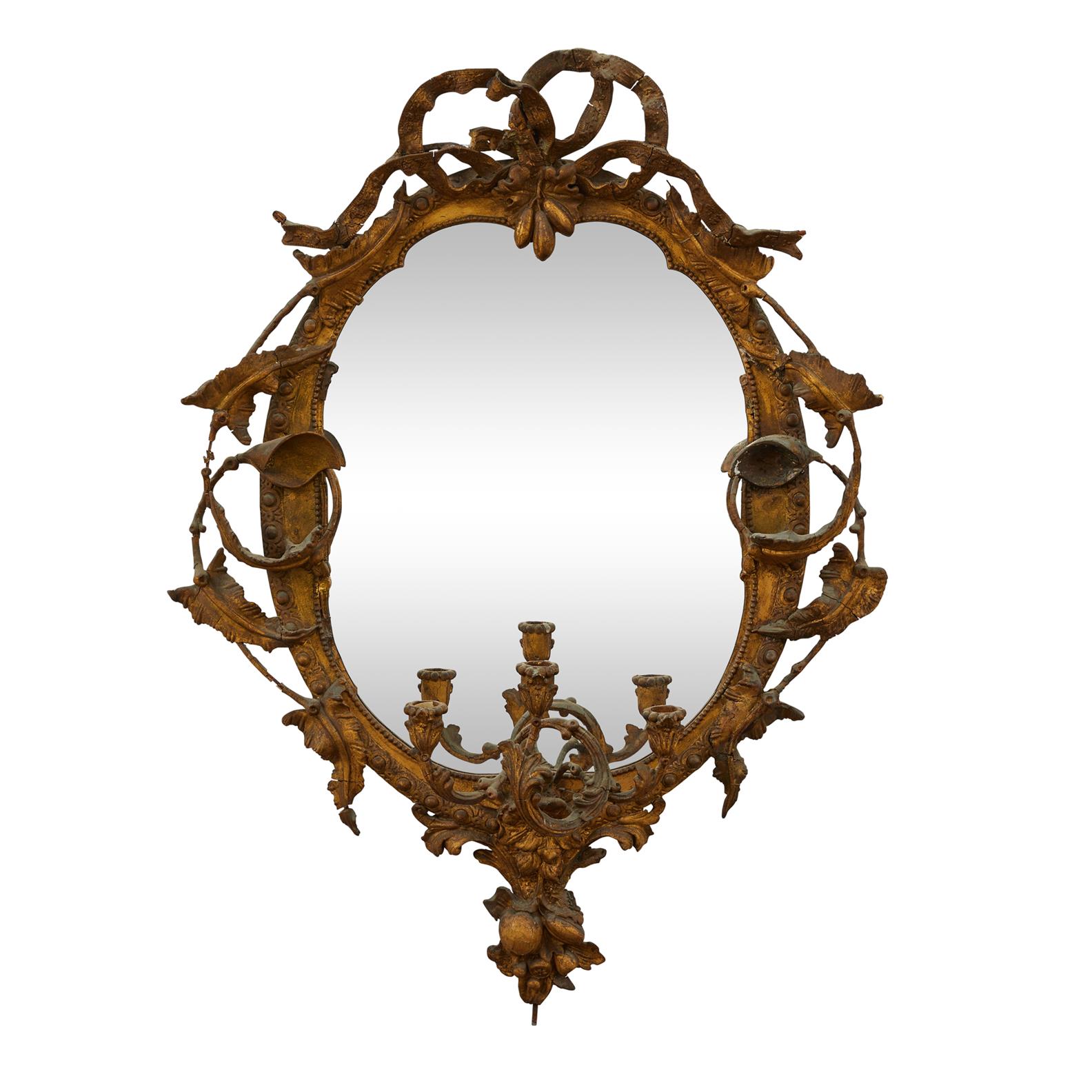 The oval plate in beaded frame richly cast with ribbon cresting and foliate scrolls, issuing three rocaille candlesticks.