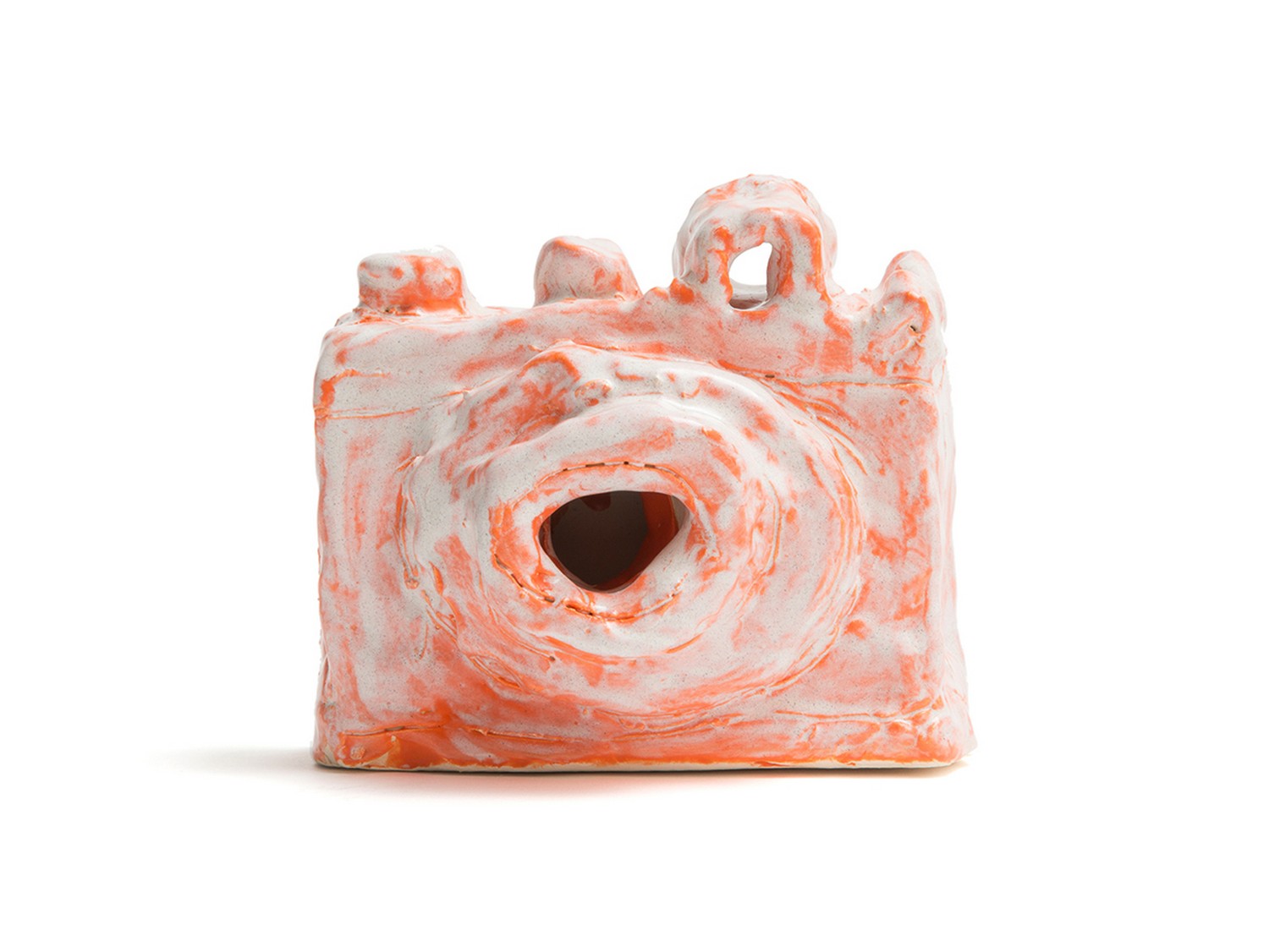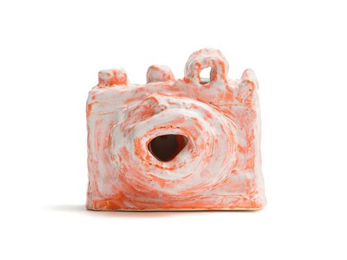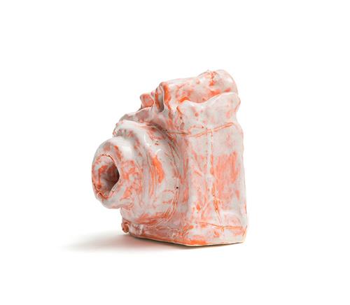 This piece is a classic example of Constable's exceptional practice, the SLR camera reinterpreted and refined to minimal form, the object covered in brilliant orange and finished with a white frosted glaze.