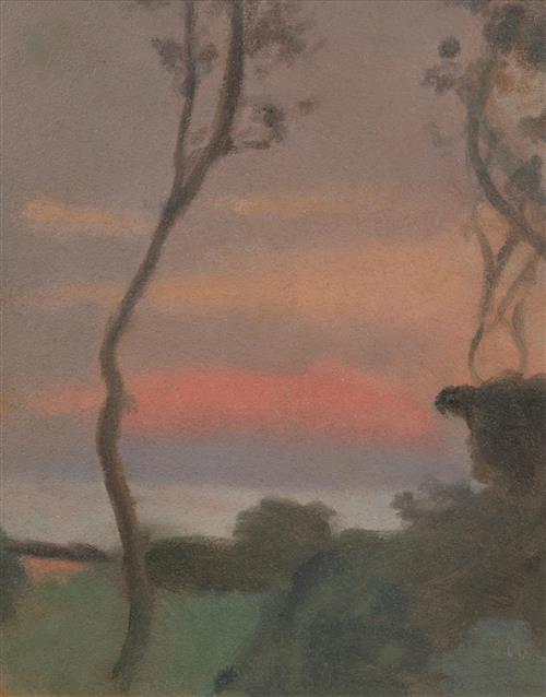 Clarice was able to capture the mesmerising effects of shifting light at various moments from dusk until dawn. In "Winter Sunset", the sea and the sky merge in glowing sweeps of sensory colour. The bold pink tones radiate heat and warmth, blended into calm greys and purples to illustrate the serenity of the vast expanse of the coast. Clarice dissolves the boundaries between light and shade yet manages to uphold a sense of depth. Perhaps it is due to the inherent spontaneity of the moment in which Clarice painted en plein air. The sun disc itself is gone, but the vivid fluorescent qualities of the fading light remain, if only for a fleeting moment long enough for Clarice to capture it.