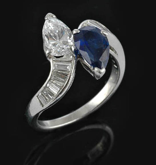 The crossover ring set with a pear cut diamond weighing 1.05cts and pear cut sapphire weighing 1.20cts, the curved shoulders channel set with tapered baguette cut diamonds, all in platinum, attributed to Oscar Heyman.