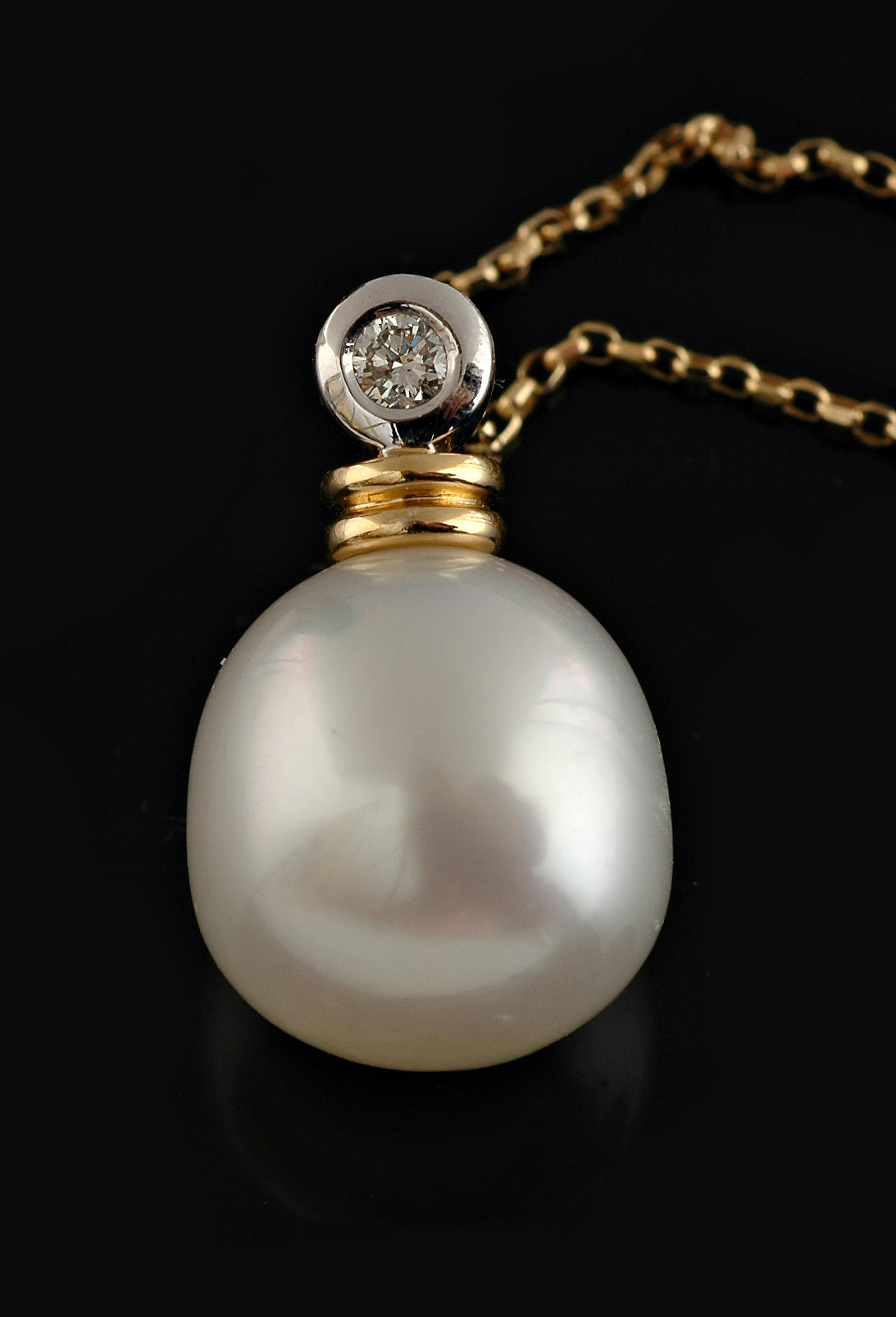 The oval pearl of silver white hues measuring 13.6mm surmounted by a diamond set bale in 18ct gold, to a 9ct gold fine trace chain.