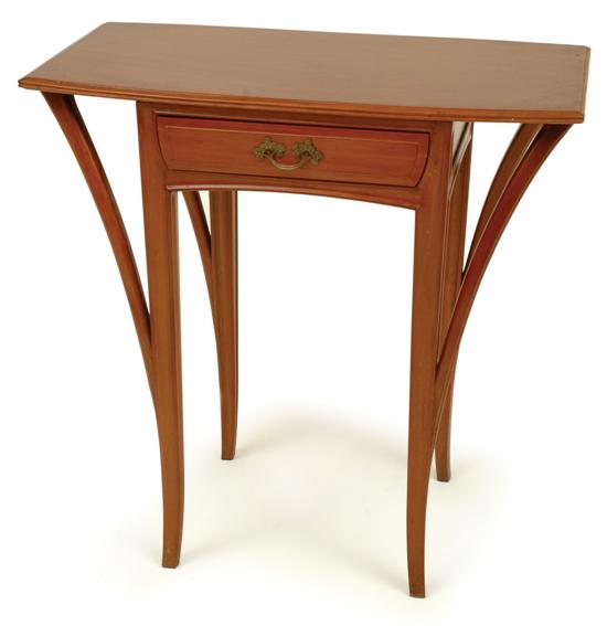 The shaped rectangular top above a single frieze drawer raised on tapering legs uniting with tapering supports, 73 x 70 x 37 cm.